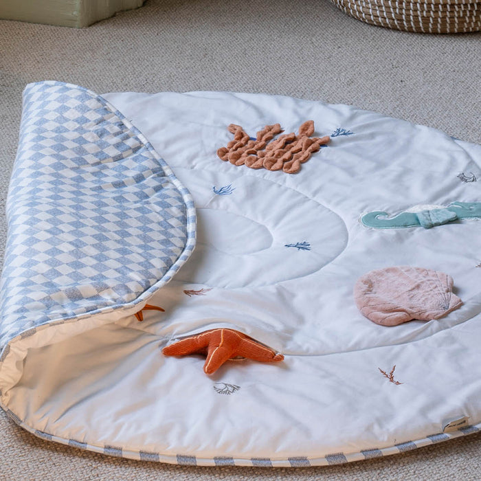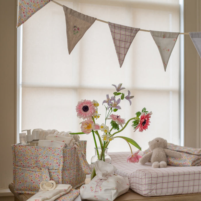 Inspired by salt air and slow coastal adventures, Shoreline features soft natural and stone checkers paired with subtle clam shell motifs. Calm, beach-worn tones designed to bring an effortless seaside