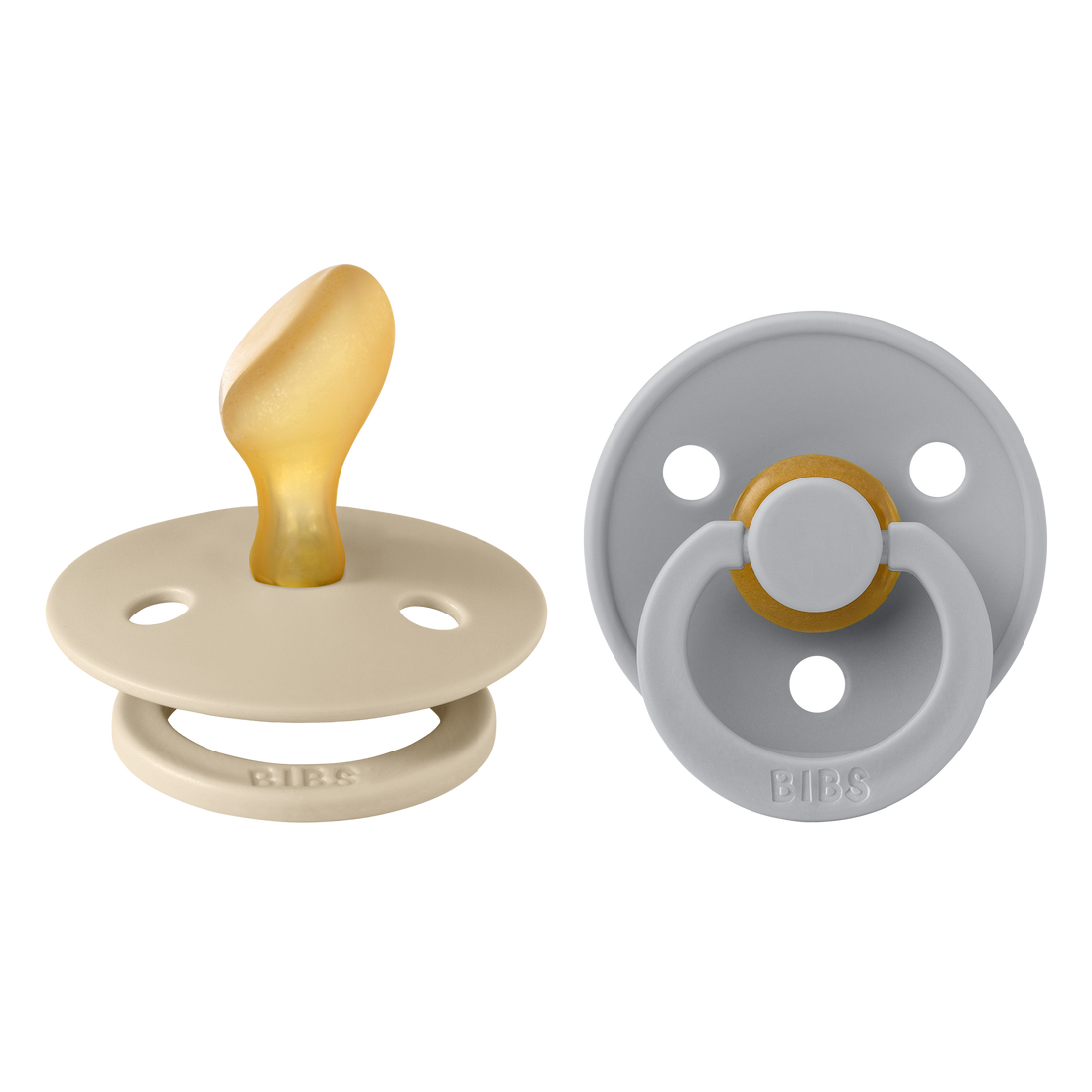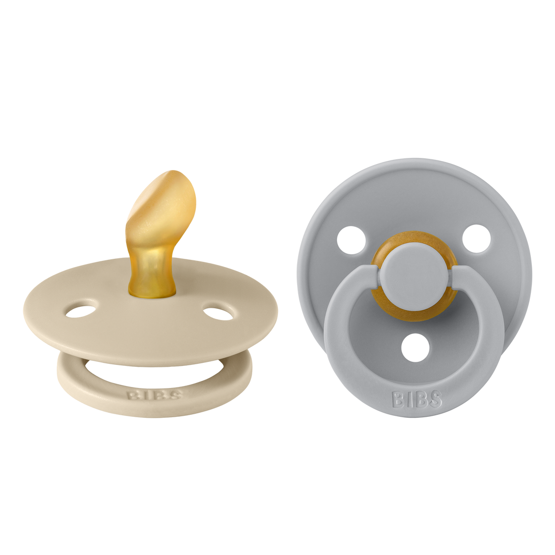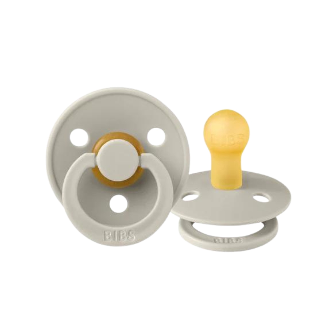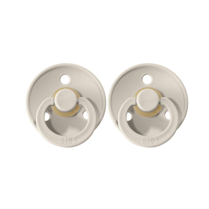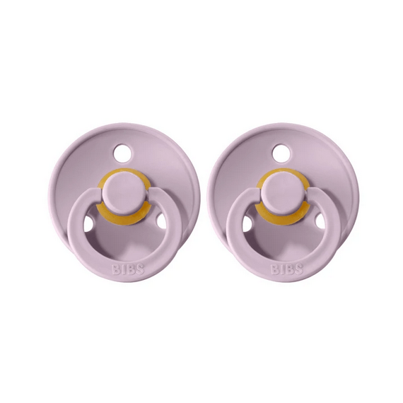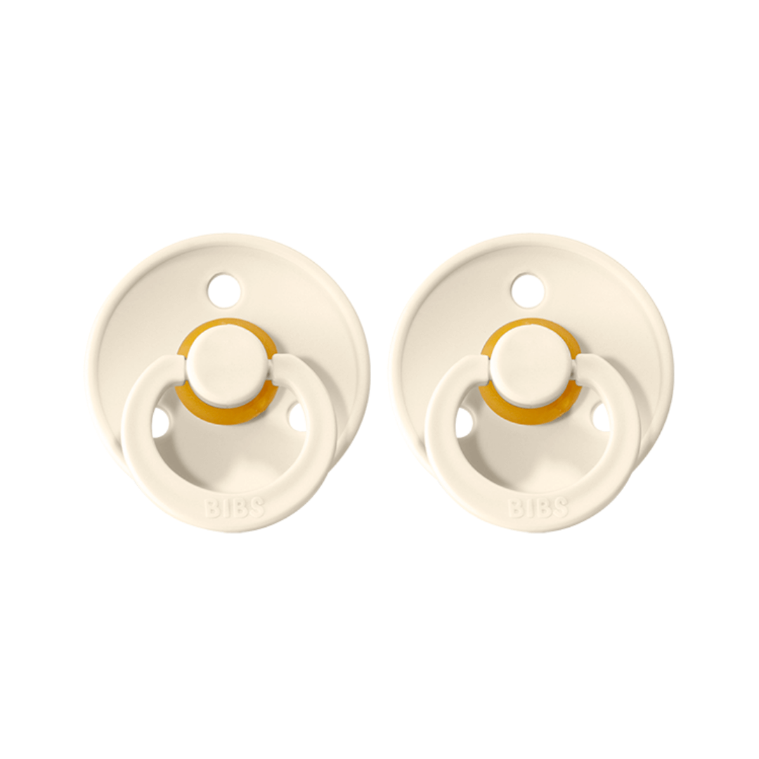 Our Colour pacifier is the original BIBS pacifier and has been on the market since 1978. It has the signature round BIBS shield with three vent holes and round BIBS engraved handle ring.