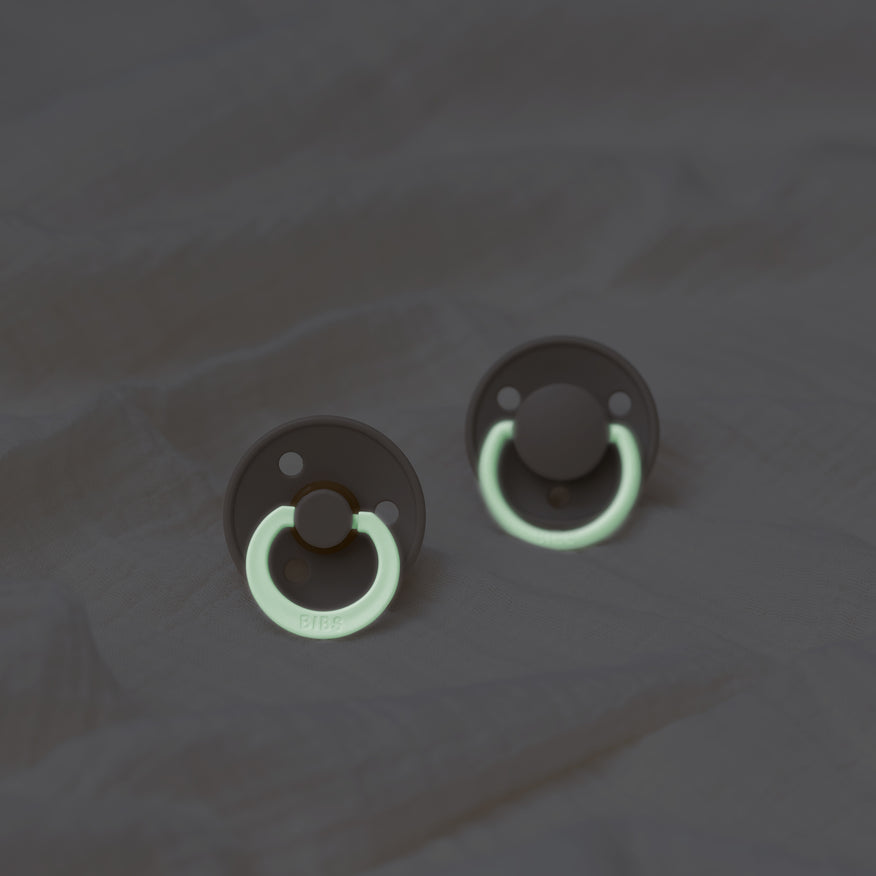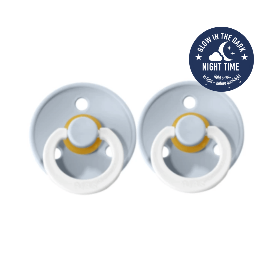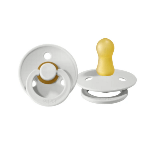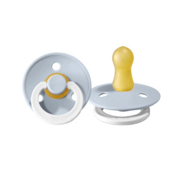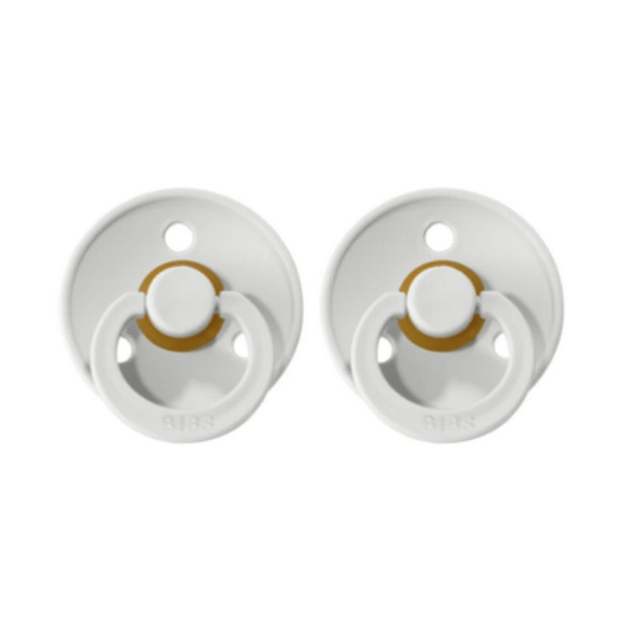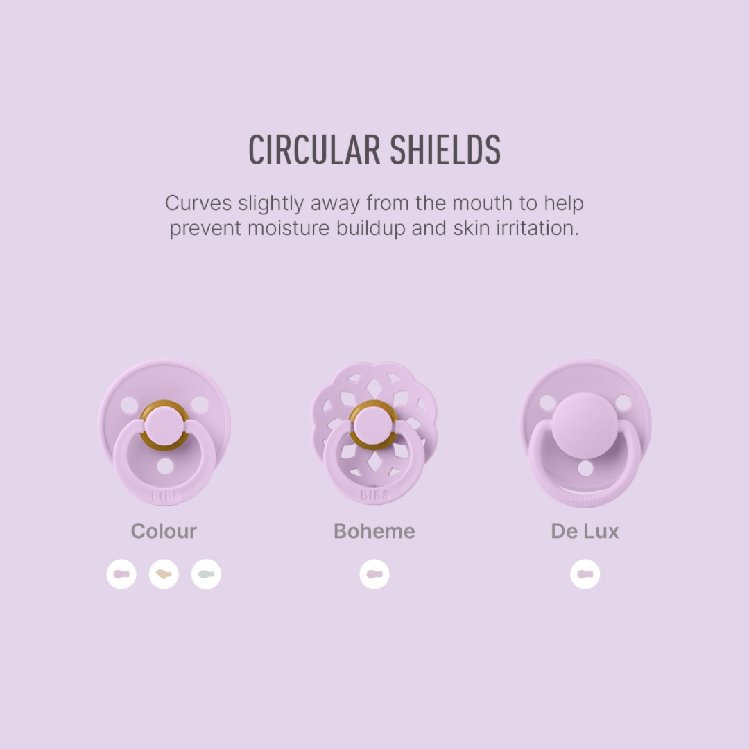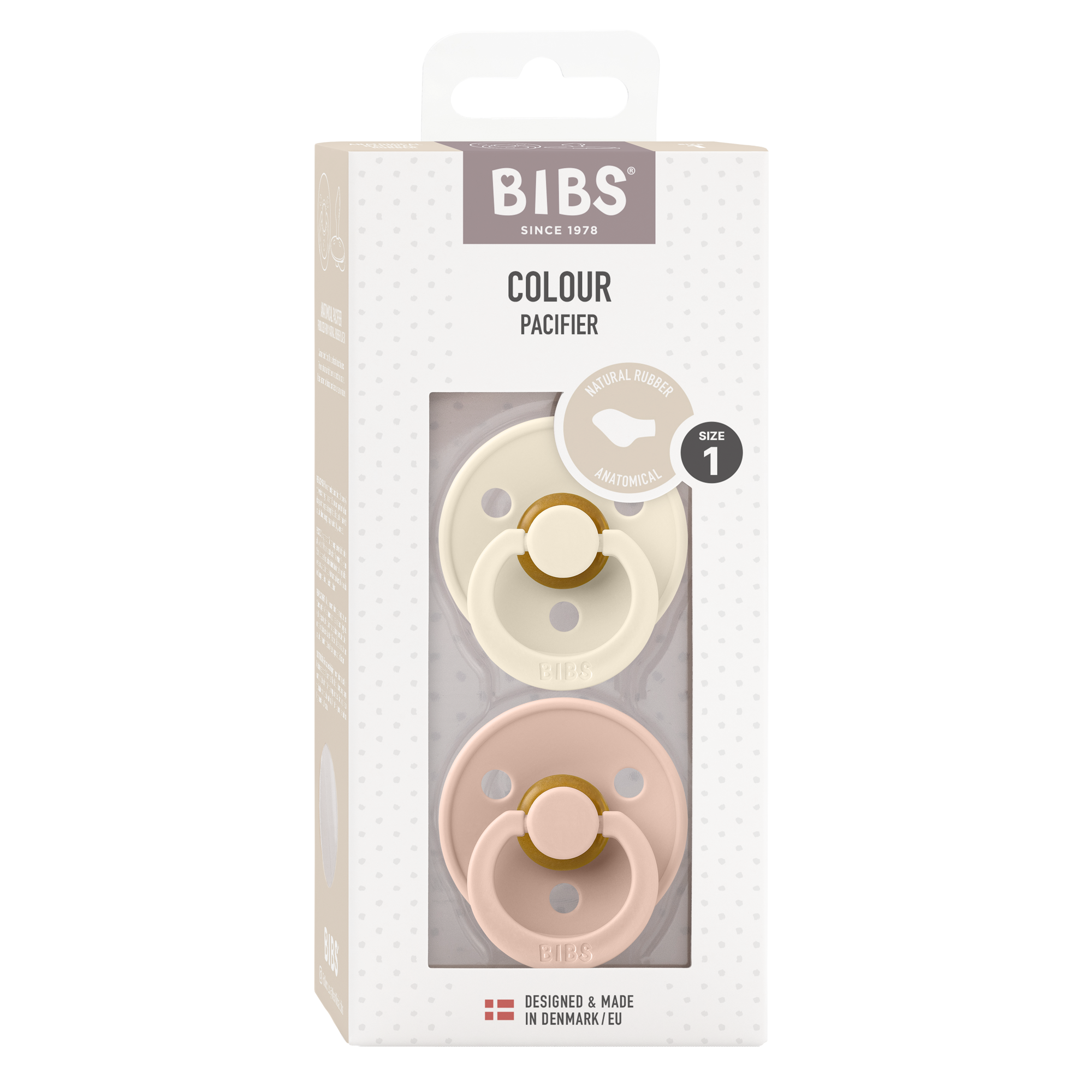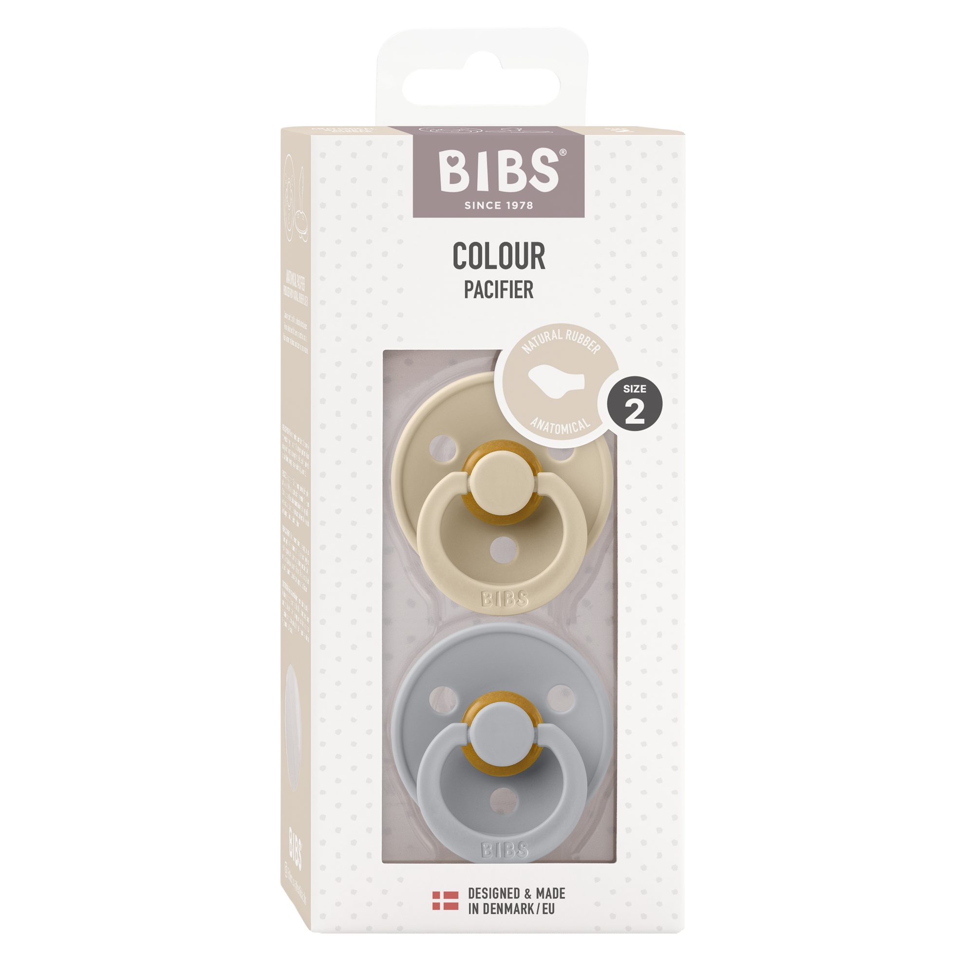 Our Colour pacifier is the original BIBS pacifier and has been on the market since 1978. It has the signature round BIBS shield with three vent holes and round BIBS engraved handle ring.