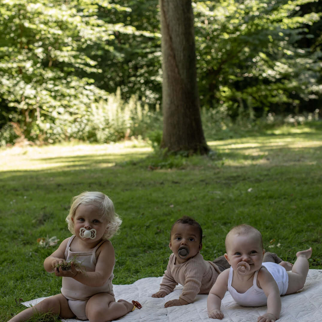 Natural Rubber latex is a natural material made from a sticky milky fluid tapped from the Hevea tree. The fluid is refined to the brown/yellow rubber you know from your pacifiers; a super soft, elastic, and resilient material very much resembling the mother’s soft nipple.