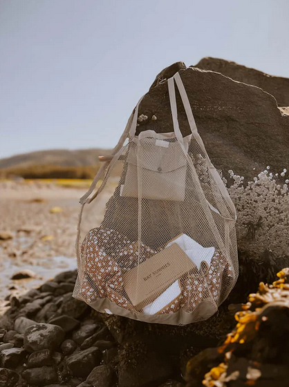 Made of recycled polyester, our net bags are the most practical accessory you can take to the beach and store all your toys, towels and accessories. They come in a bag that, when opened, turns into an XL mesh bag measuring 60 x 40 cm. Super functional and large, it has a small pocket where you can store your most delicate belongings.