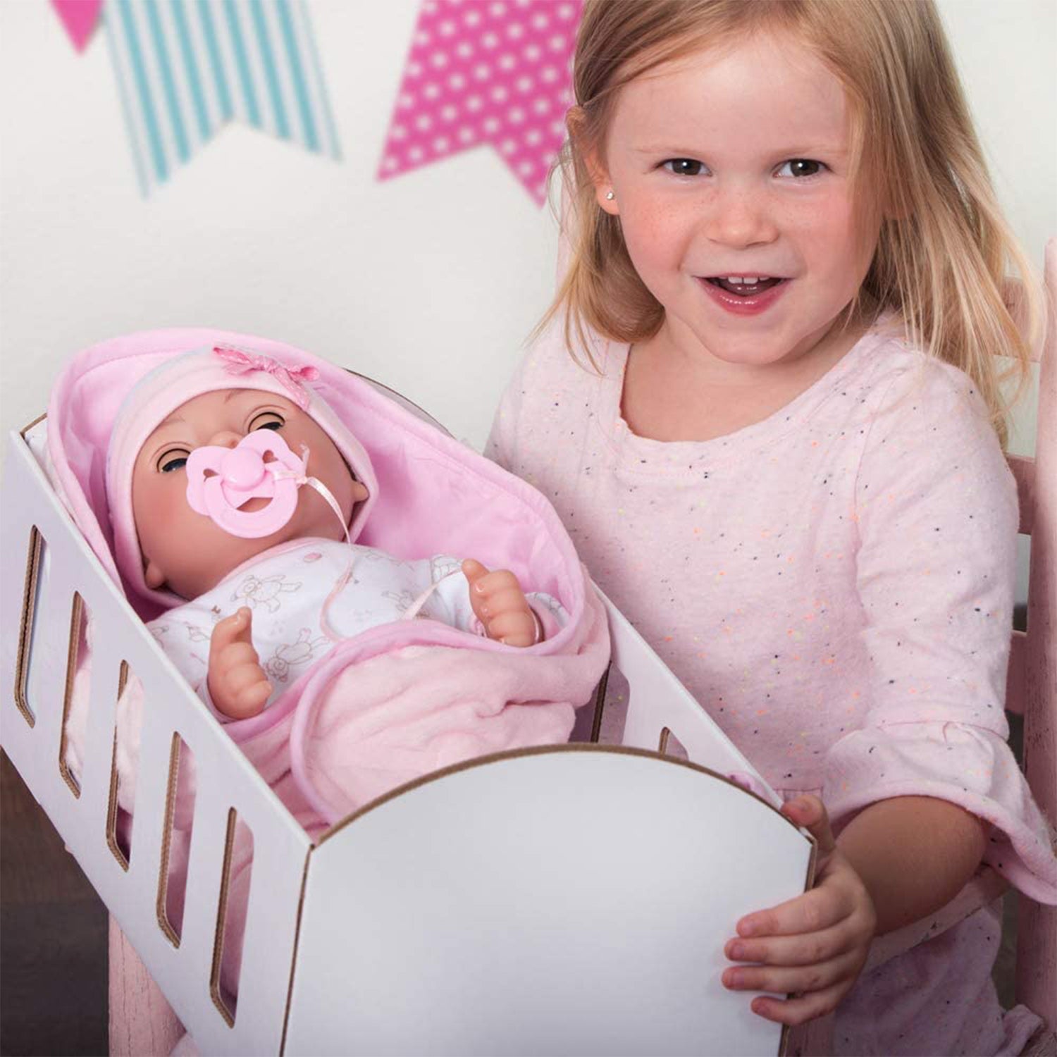 - Includes Certificate of Adoption, Pacifier, Hospital Bracelet, Disposable Diaper, Pink Blanket and Crib