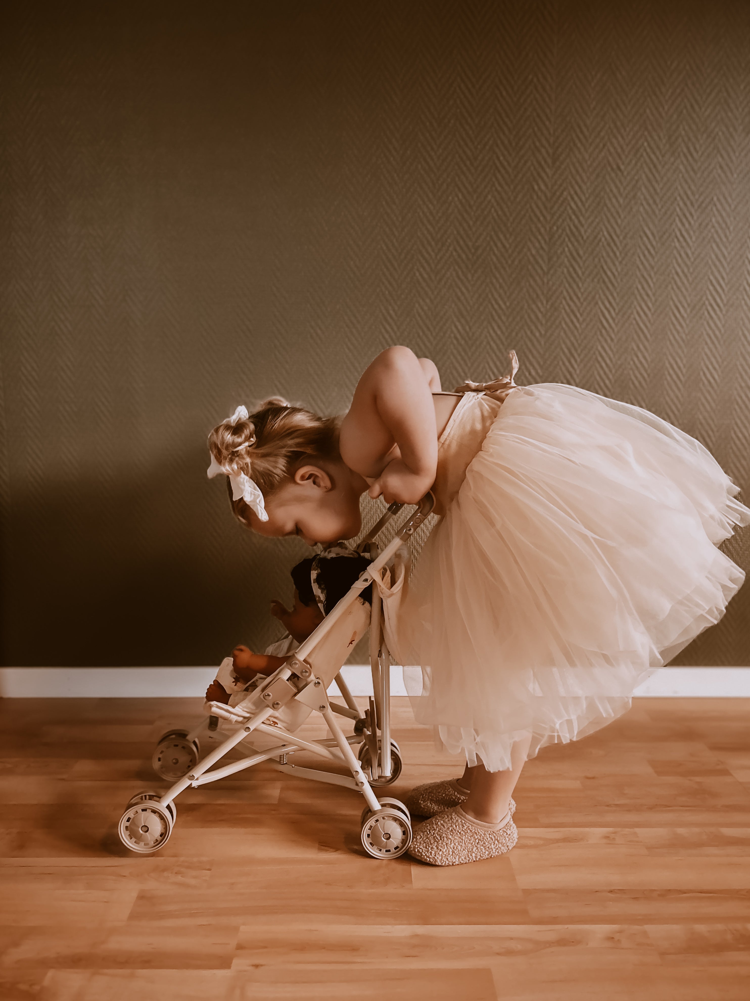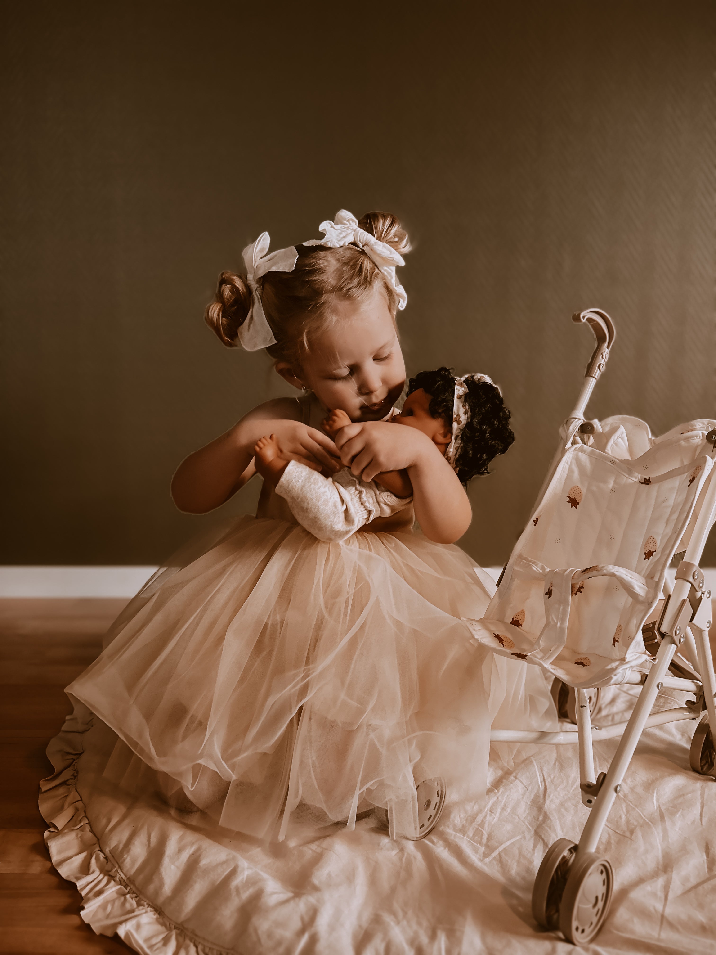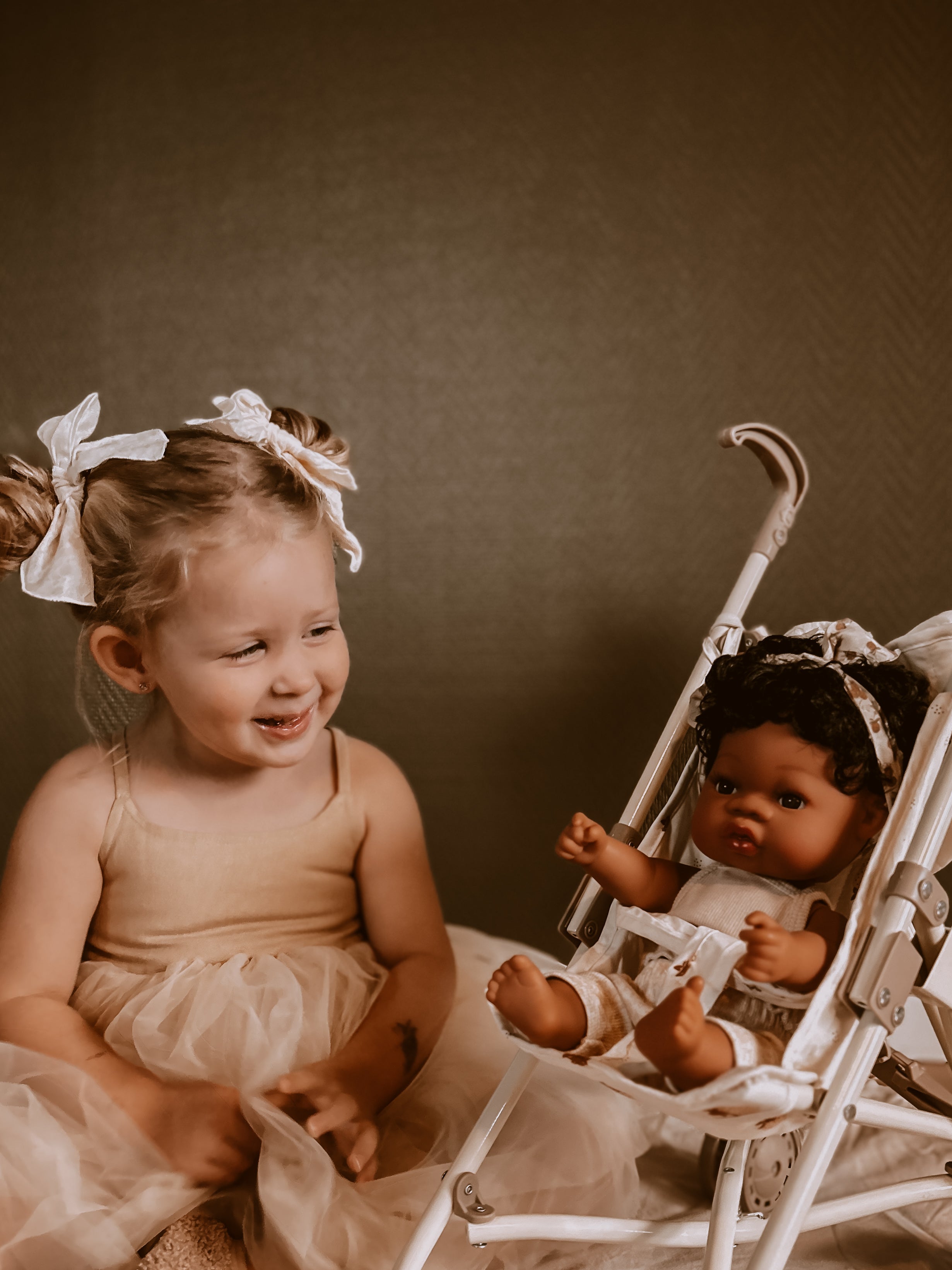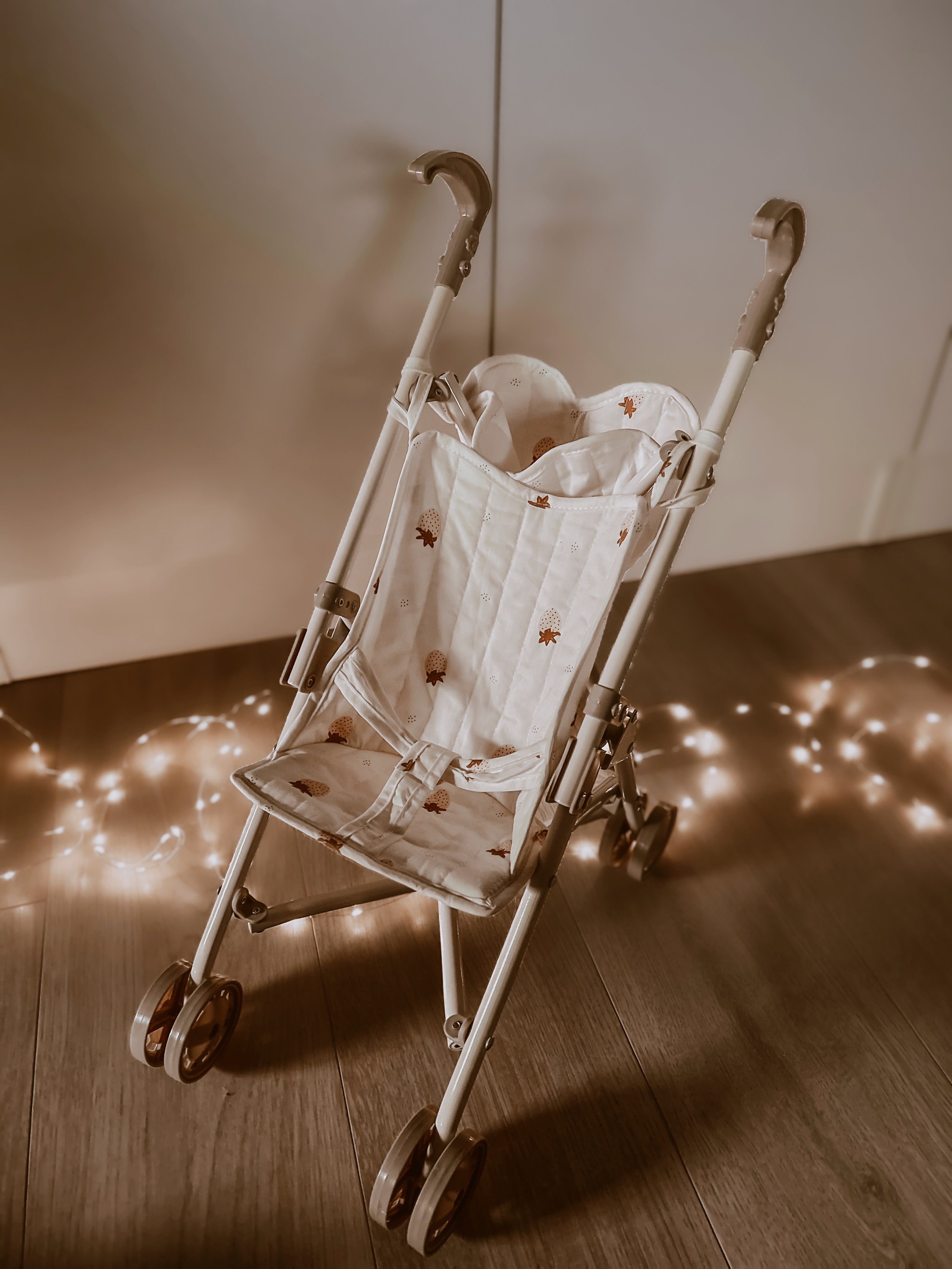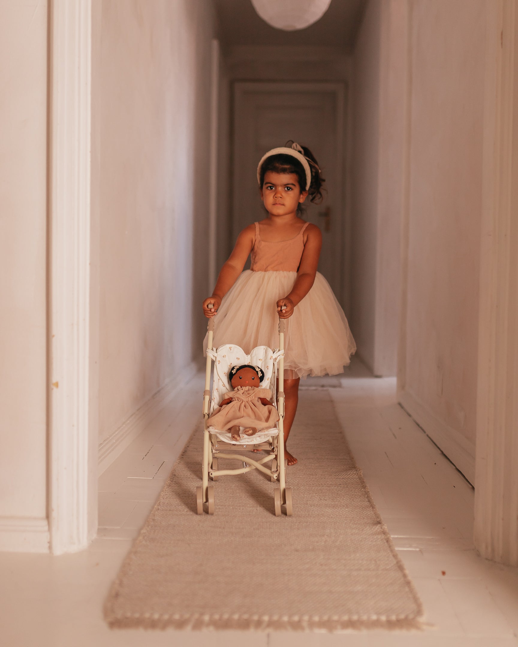 Our prams are made of organic cotton with removable fabrics. They have a heart-shaped bag where small accessories can be stored. It has double wheels on all the legs and the frame is made of iron.
