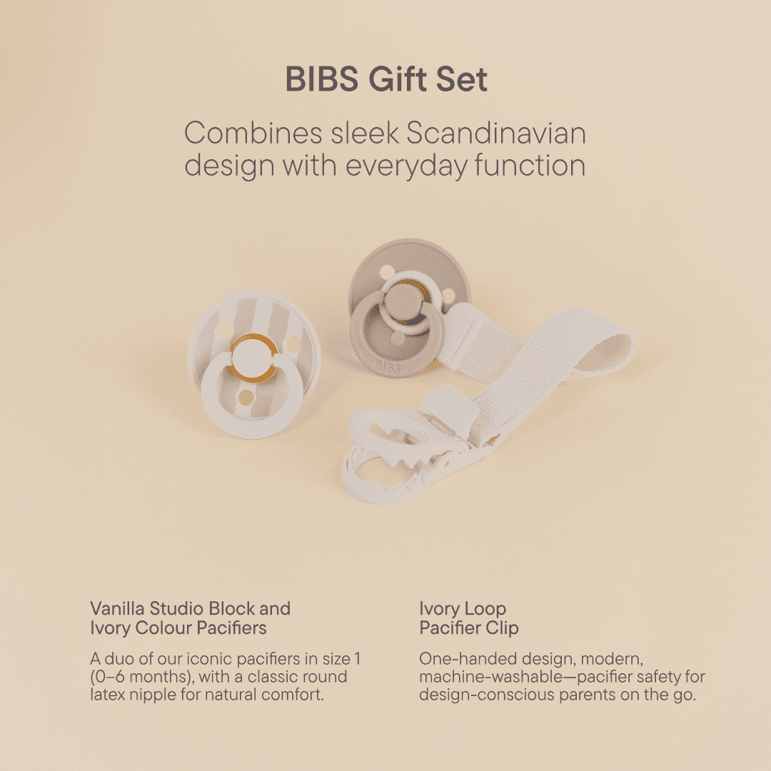 BIBS Gift Set is a sweet product bundle consisting of two BIBS Studio Collection Latex Pacifiers & Loop Clip. The perfect product combination for newborns, and ideal as a gift for baby showers, as a maternity gift, or for new or expecting parents who want the absolute best for their little one.