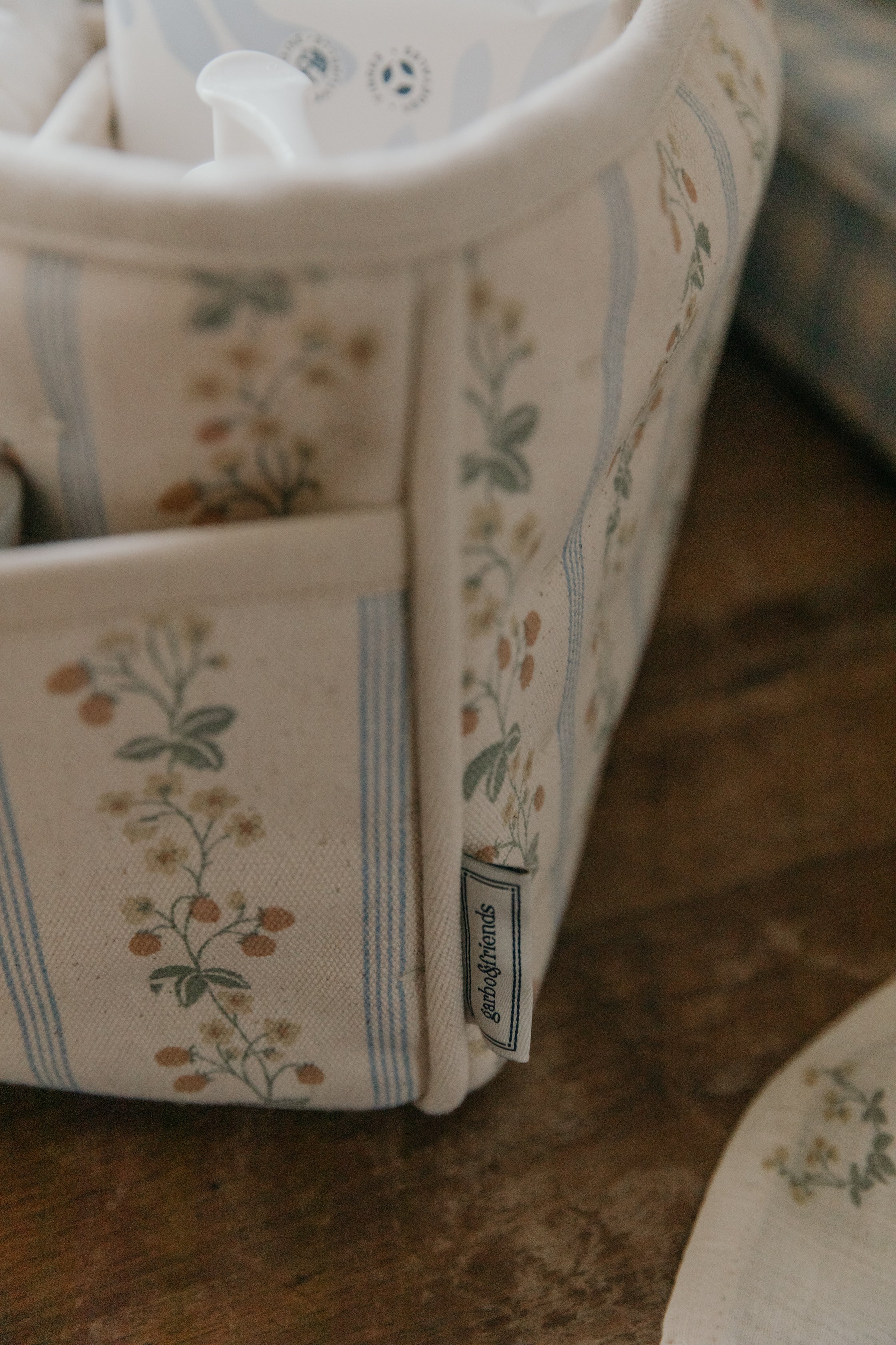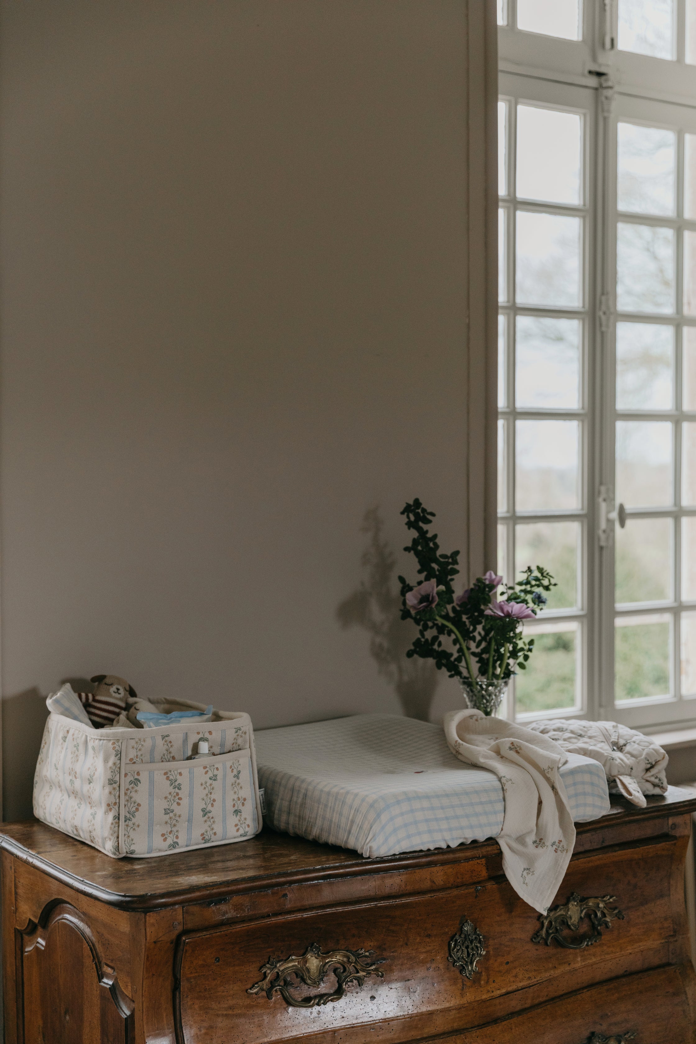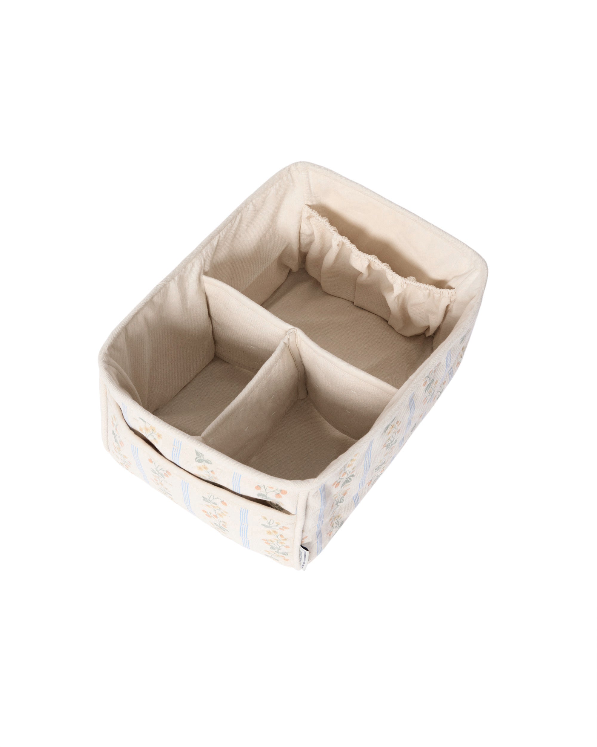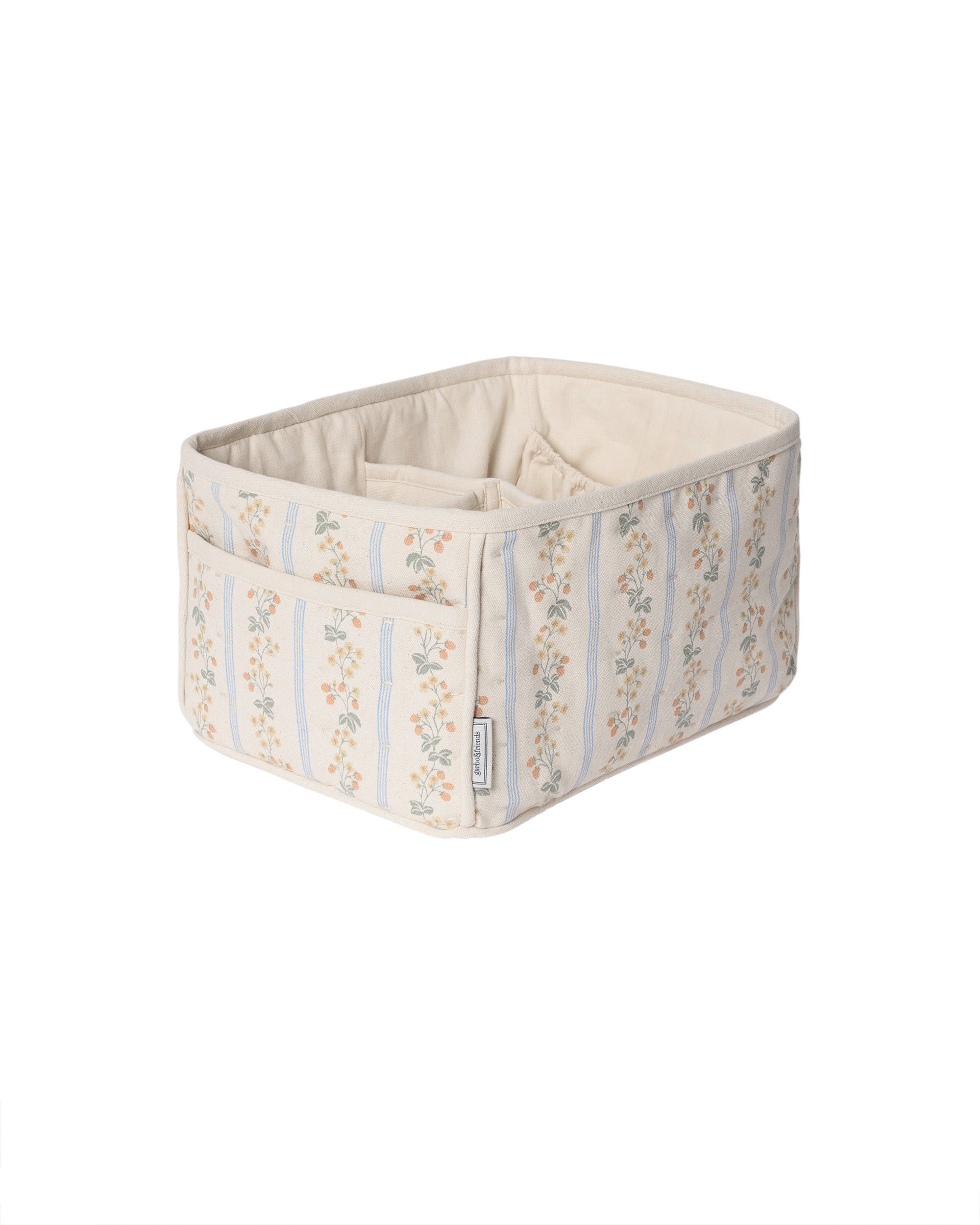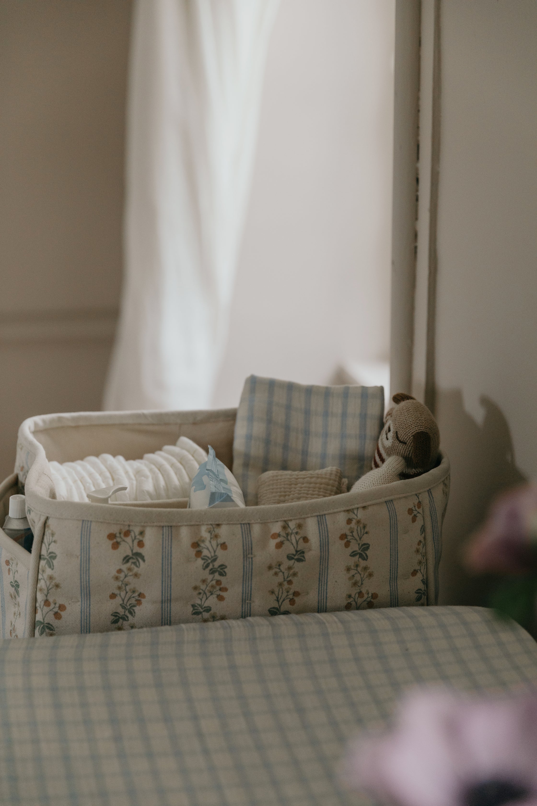 Our diaper caddy is crafted from organic cotton canvas and designed with multiple compartments and elastic side pockets to keep diapers, wipes, creams, and other baby essentials beautifully organized and within easy reach. Practical yet decorative, it blends functionality with style, making it the perfect addition to any nursery or changing station.