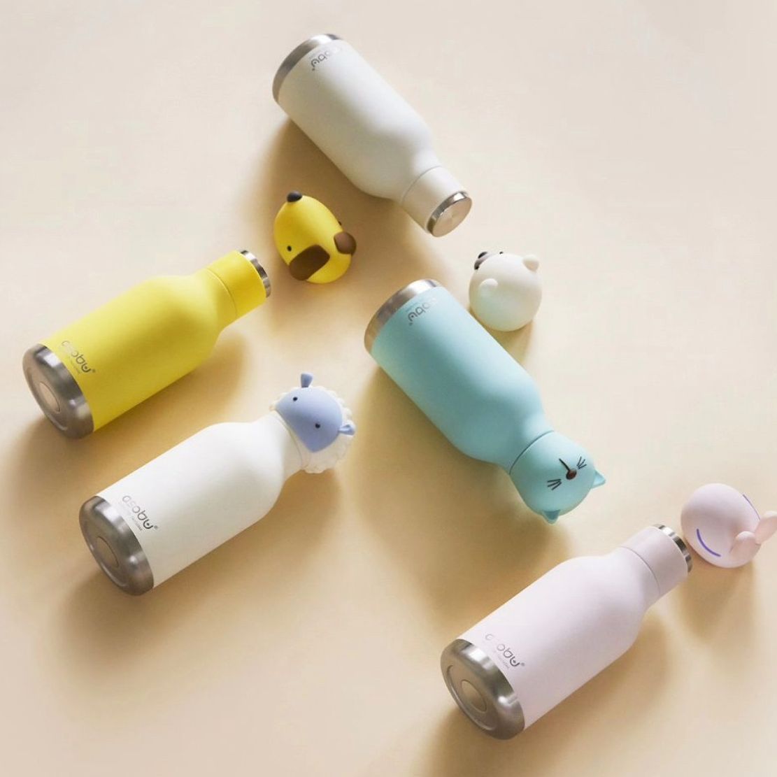 Stainless steel water bottle with an adorable soft-touch character head on the lid.