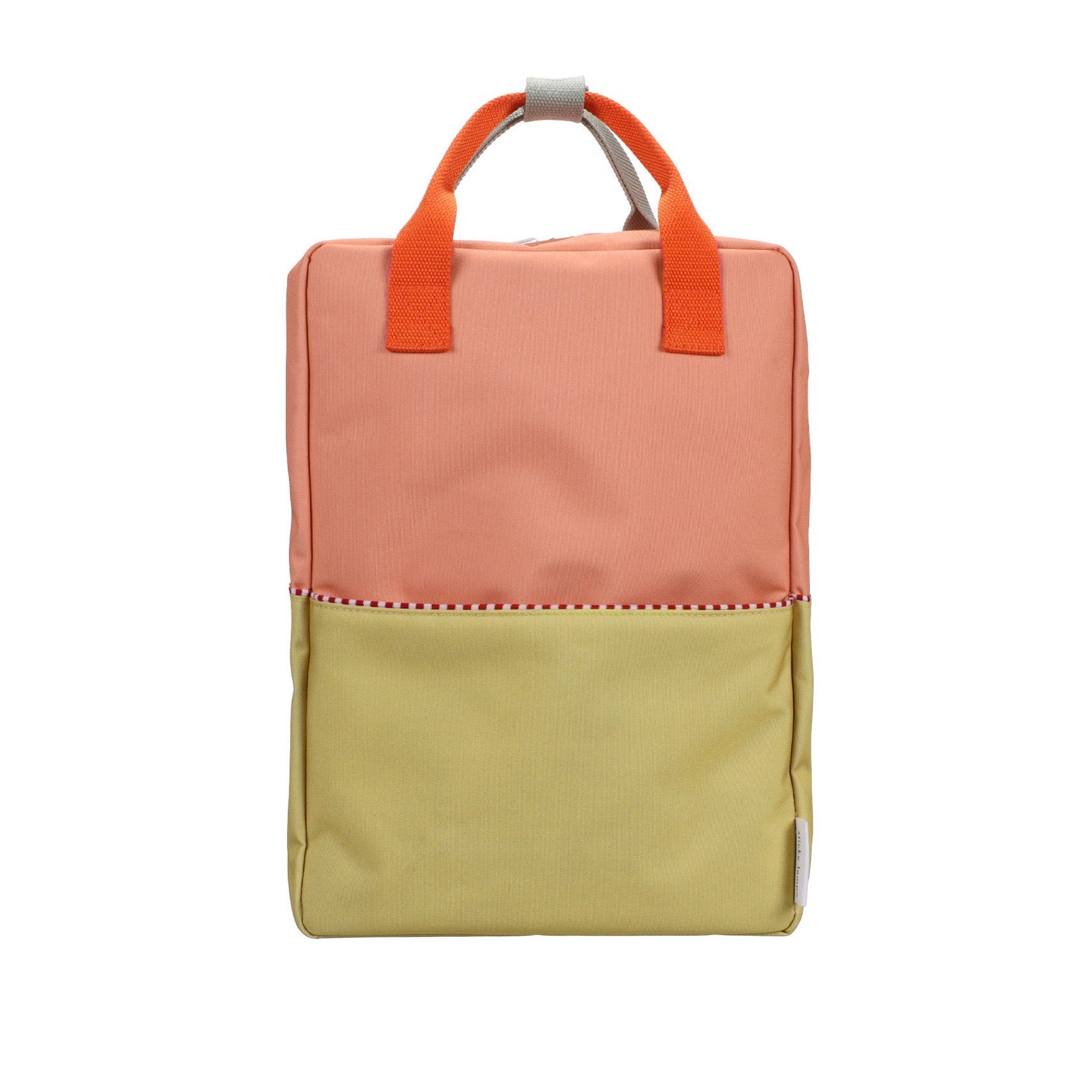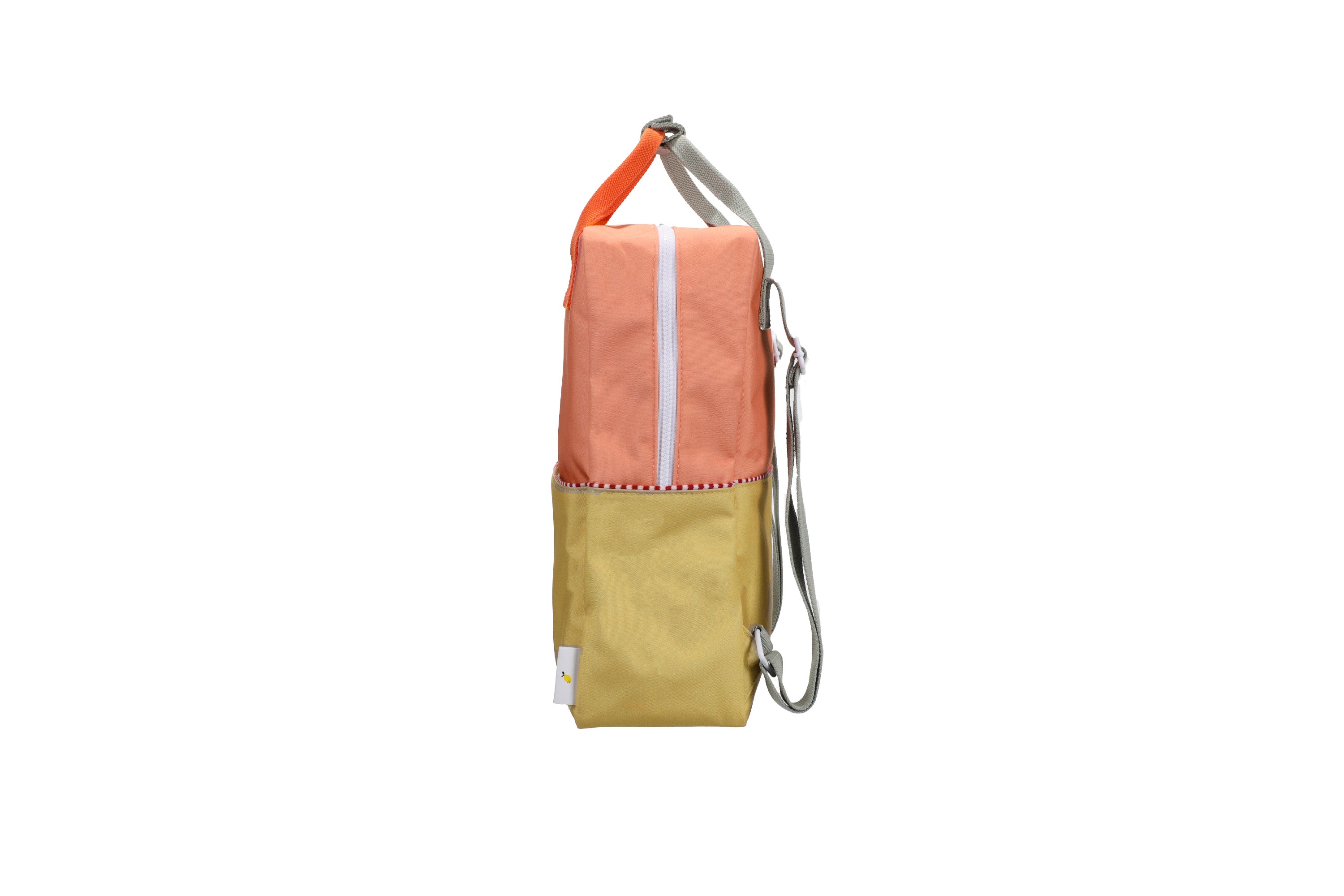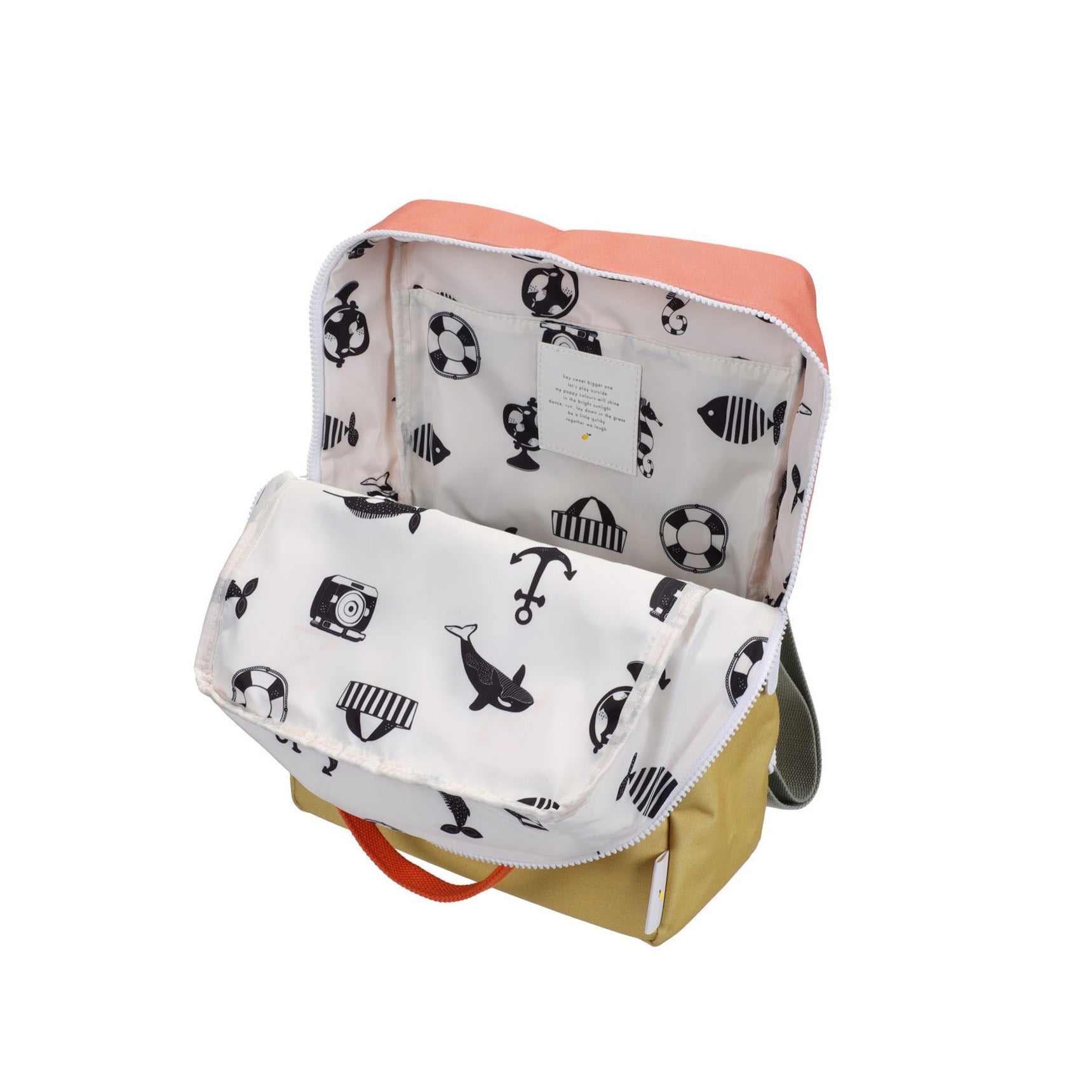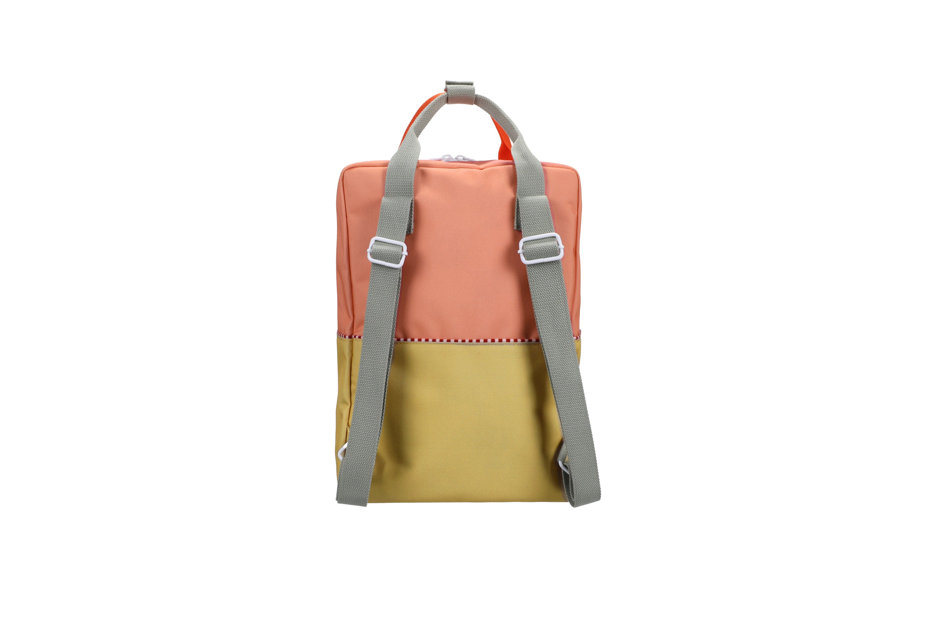 A mix of colors makes this bag stand out! It has an extra pocket on the front, waterproof lining with a handdrawn pattern and adjustable shoulder straps. On the inside you'll find an elastic band that serves as a bottle holder and a pocket all over the back that closes with velcro. There is also a name tag to put your info.