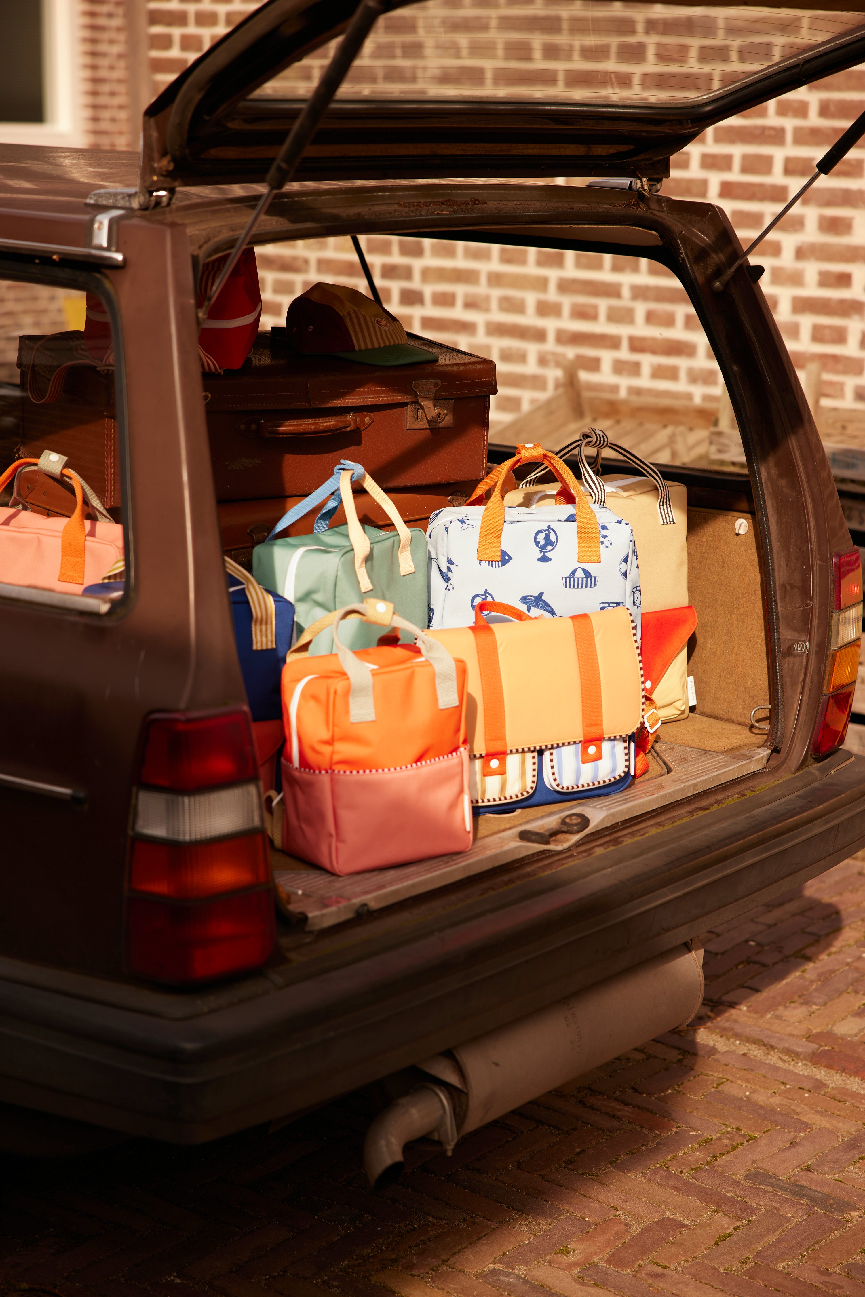 A mix of colors makes this bag stand out! It has an extra pocket on the front, waterproof lining with a handdrawn pattern and adjustable shoulder straps. On the inside you'll find an elastic band that serves as a bottle holder and a pocket all over the back that closes with velcro. There is also a name tag to put your info.