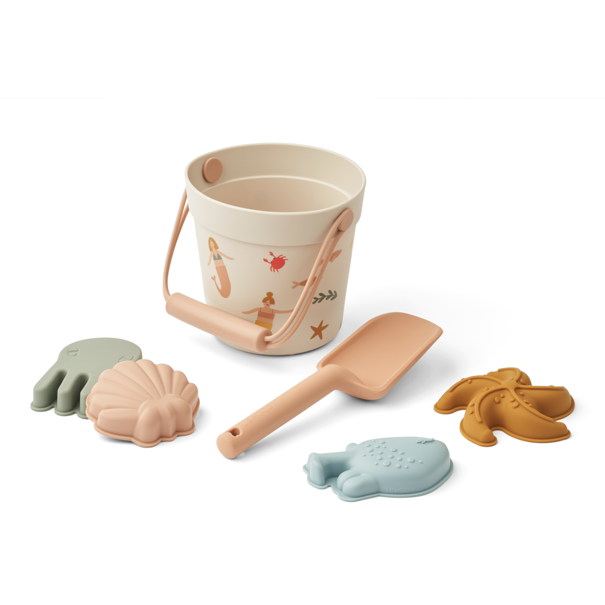 Dimensions: Bucket: Diameter (cm) 15, Height (cm) 14. Shovel: Width (cm) 7, Length (cm) 23. Fish: Height (cm) 2,5, Width (cm) 11. Shell: Height (cm) 2,5, Width (cm) 9. Octupus: Height (cm) 2,5, Width (cm) 10, Length (cm) 6,8. Star: Height (cm) 11, Width (cm) 11