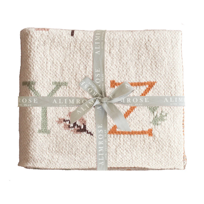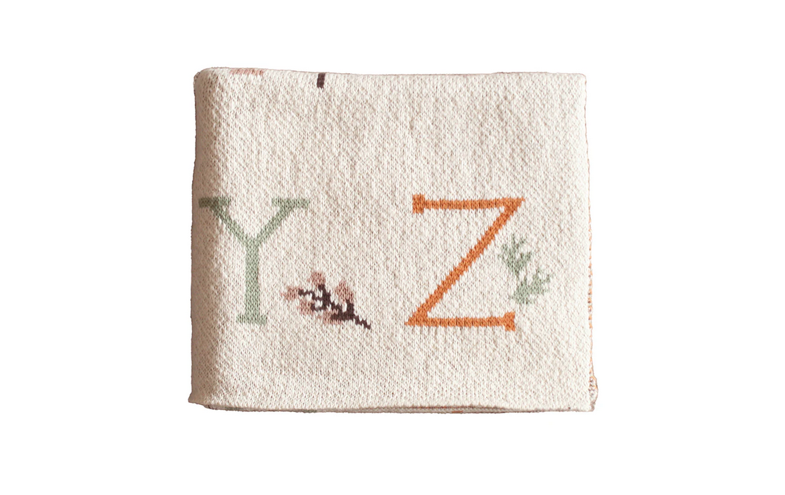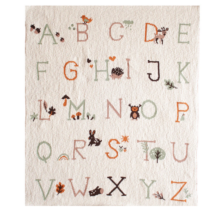 A unique and gorgeous thick 100% cotton knit natural baby blanket featuring letters of the alphabet. Adorable!