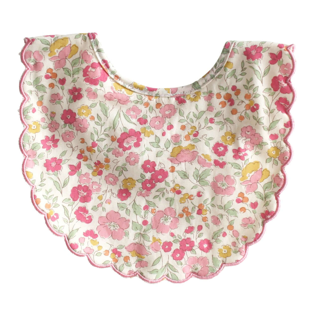 This dainty scallop edge bib has been a favourite of ours for years. A classic & beautiful bib which will dress up any outfit and make meal time sweet! Velcro fastening. Machine washable.