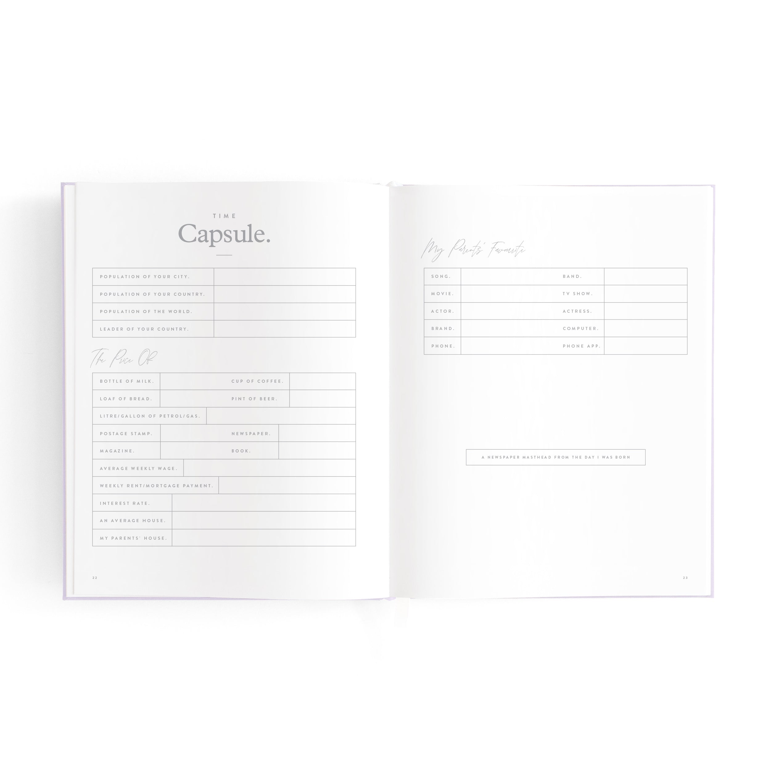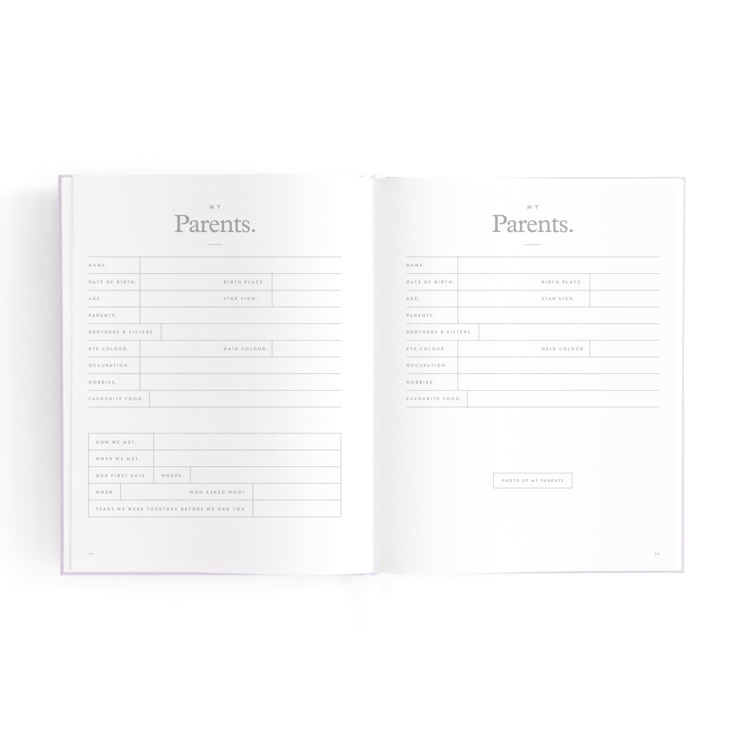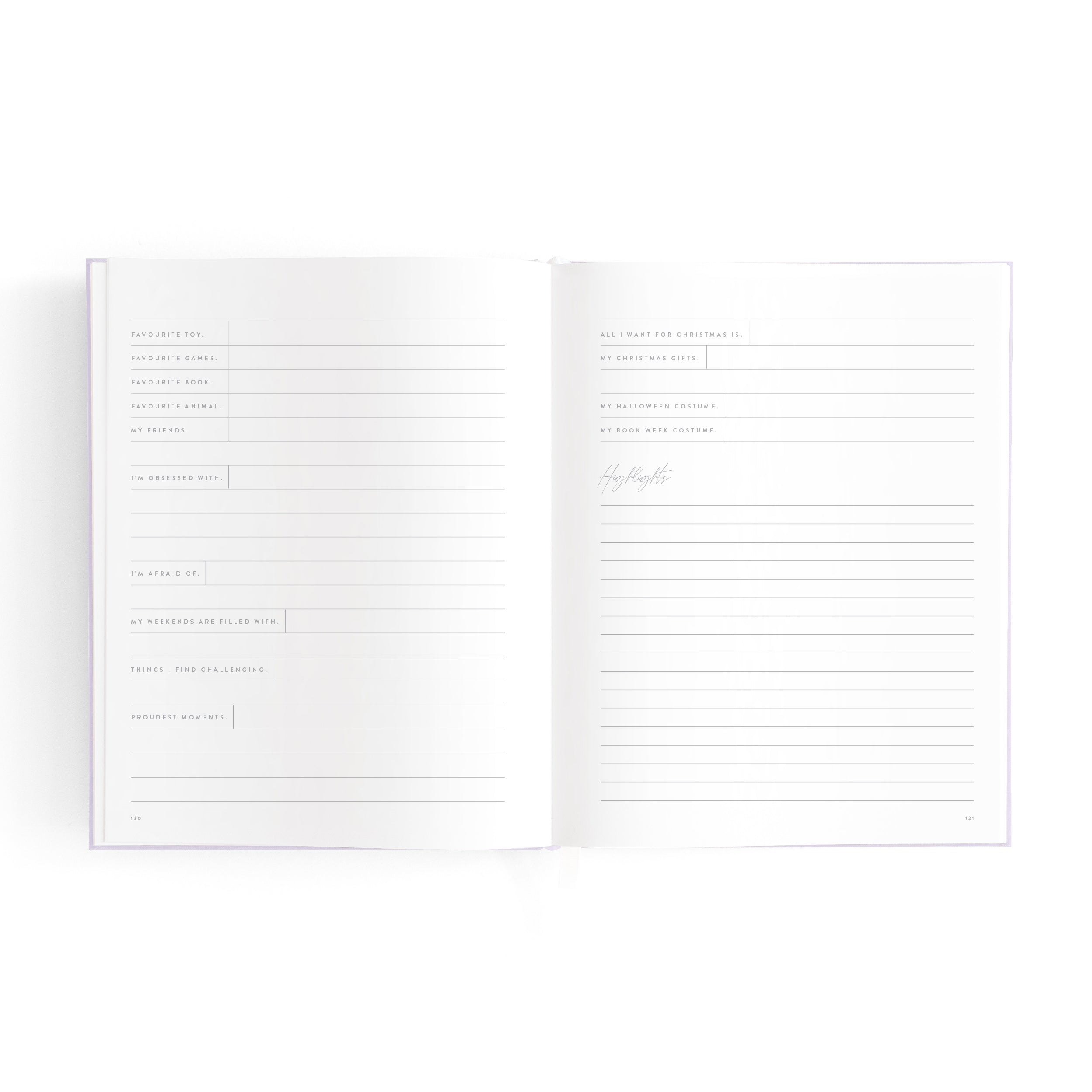 A beautiful keepsake for the whole family to enjoy. Includes: important milestones and firsts, family profiles, family tree and travel map, playgroup and daycare through to kindy and school years, time capsule, nicknames and celebrations, pets, friends, birthdays and more.
