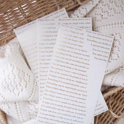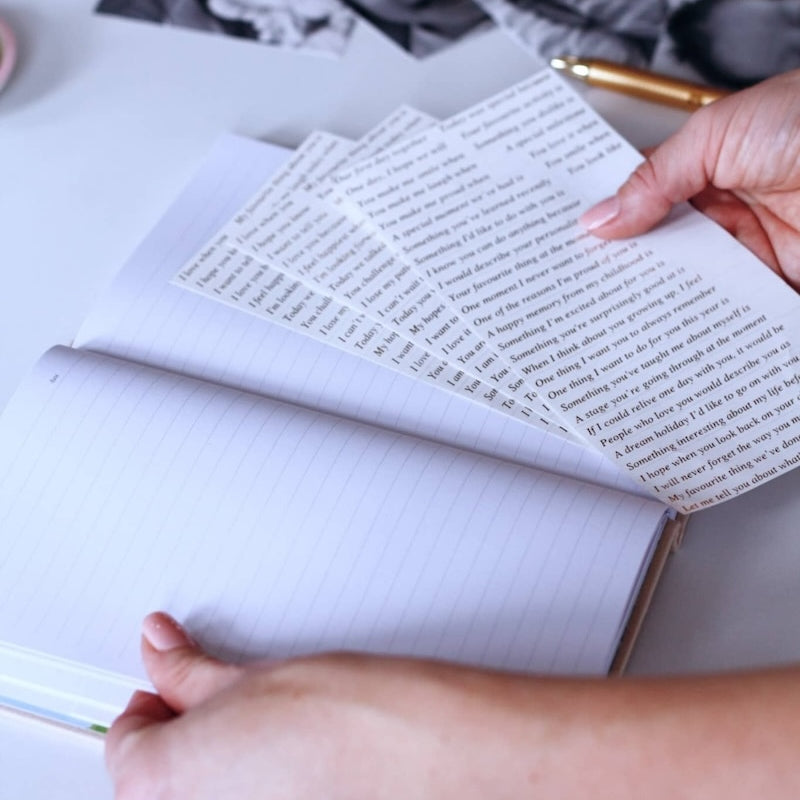 Our heirloom ‘to my daughter’ journal simplifies the process of creating a precious keepsake of memories. Whether as a baby journal, or legacy gift to pass down to an adult daughter, our luxurious gold foil journal prompt stickers inspire you to document your life and theirs.