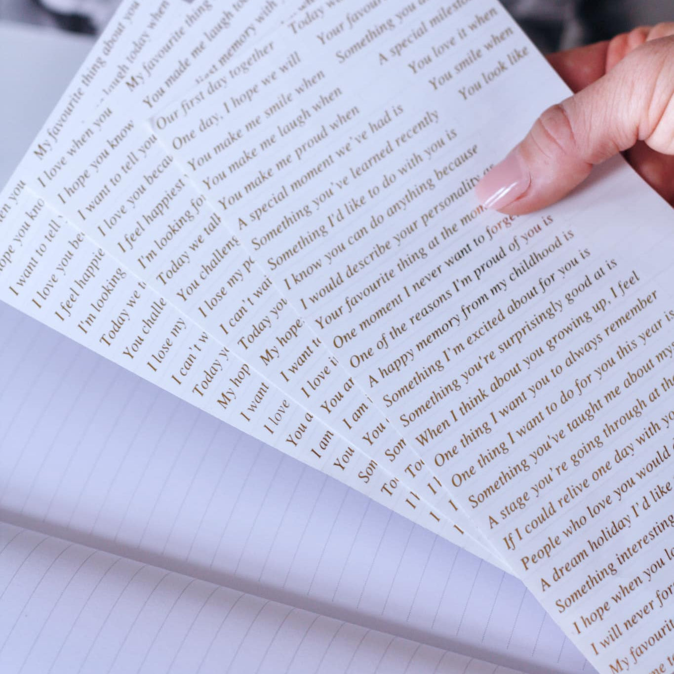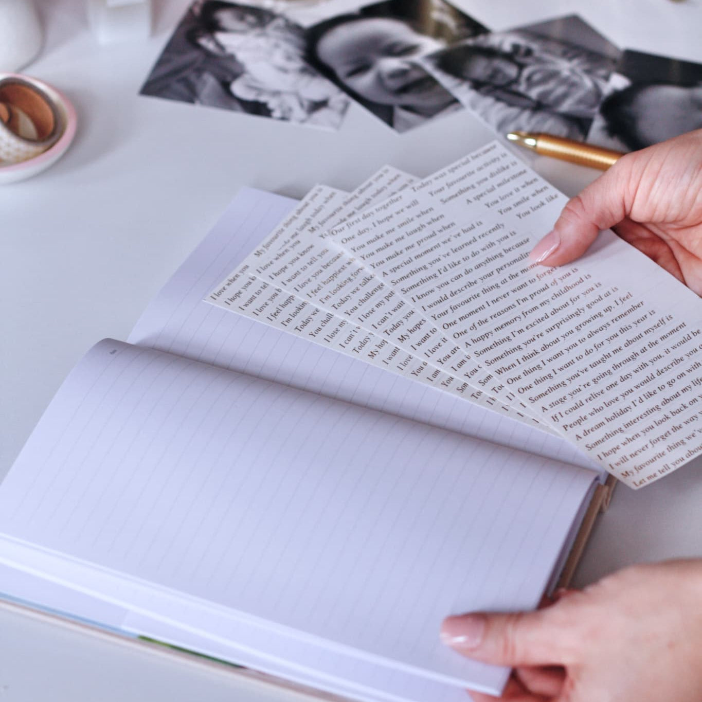 Our heirloom ‘to my son’ journal simplifies the process of creating a precious keepsake of memories. Whether as a baby journal, or legacy gift to pass down to an adult son, our luxurious gold foil journal prompt stickers inspire you to document your life and theirs.