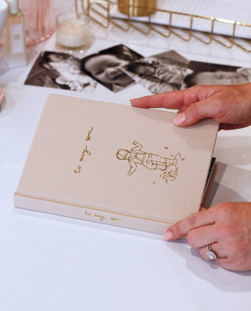 As with all of our baby journals, you can start at any age, choose your own journal prompt sticker, and write as often as you like. If you prefer our minimalist style, the original ‘to my son‘ is available in latte and vintage blue.