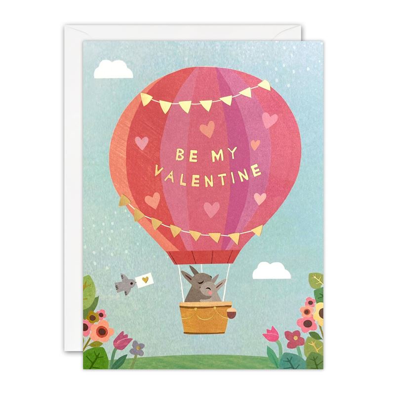 A cute Valentine's Day card illustrated by Linda Tordoff. The image on the front of the card features rabbits hugging in the basket of a hot air balloon. Elements within the design are foiled in gold.