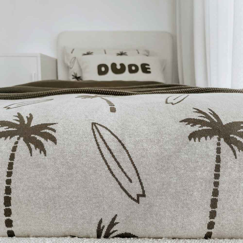 Olive Green with Natural Marle Palm Trees & Surfboards, with a plain Olive reverse. Luxuriously soft and made from the finest quality of cotton yarns, Bengali fitted jersey cot sheets are designed to stand the test of time.