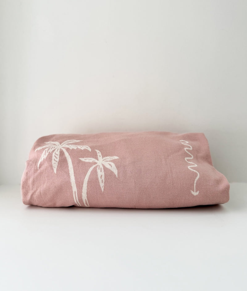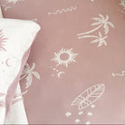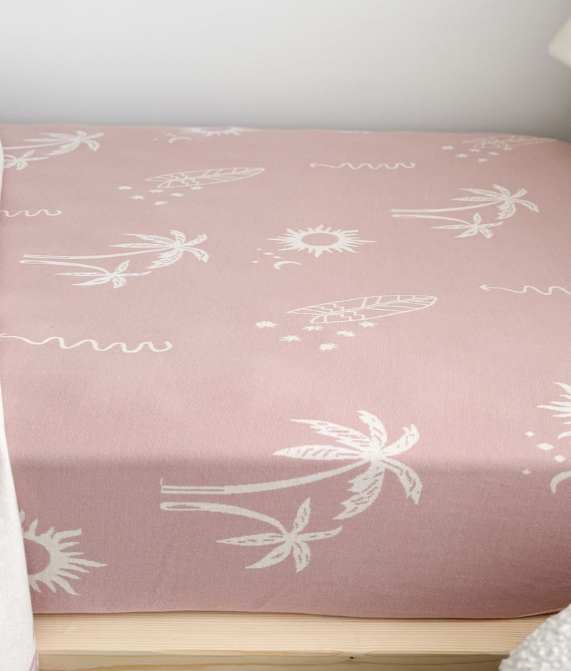 Cameo Pink with Calico Ivory Palm Trees, Suns, & Surfboards. Luxuriously soft and made from the finest quality of cotton yarns. Bengali fitted jersey cotton sheets are designed to stand the test of time.