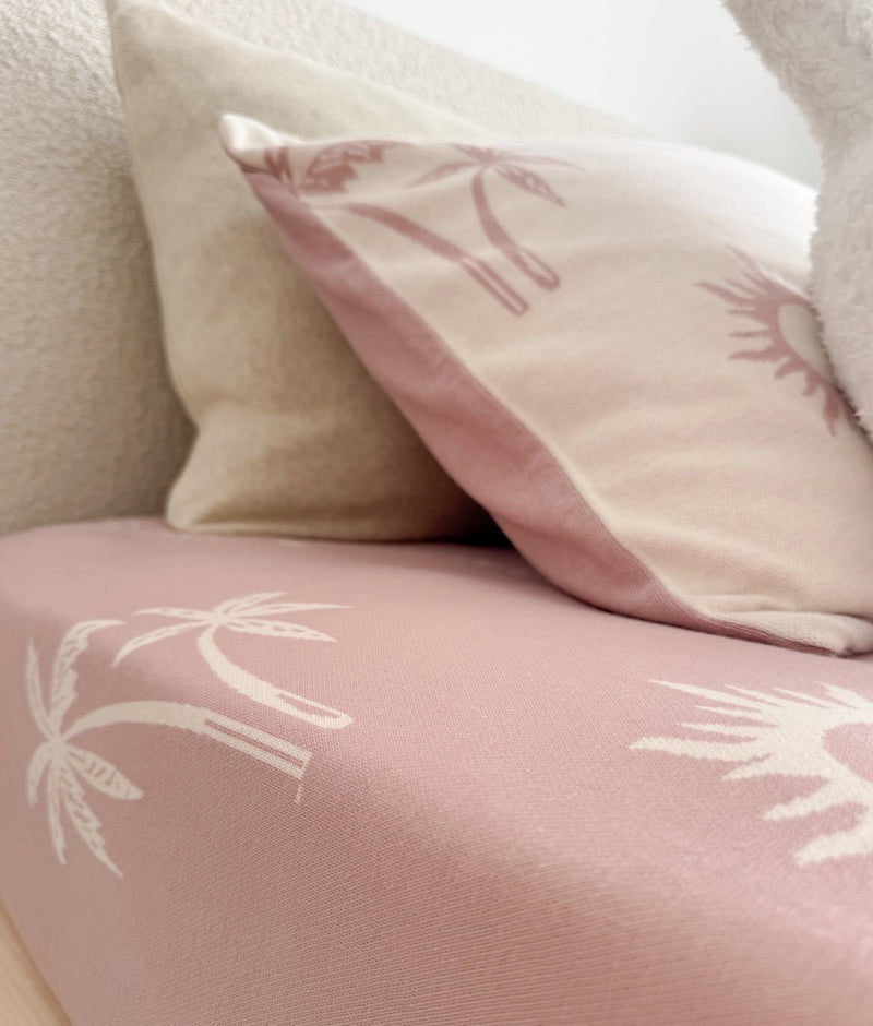 Calico Ivory with Cameo Pink Palm Trees, Suns, and Surfboards — with a plain Cameo Pink reverse. Woven from 100% Pure Cotton, our luxuriously soft pillowcases provide maximum comfort and warmth during sleep time.