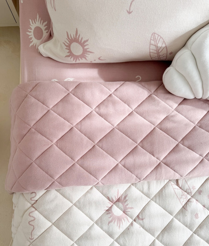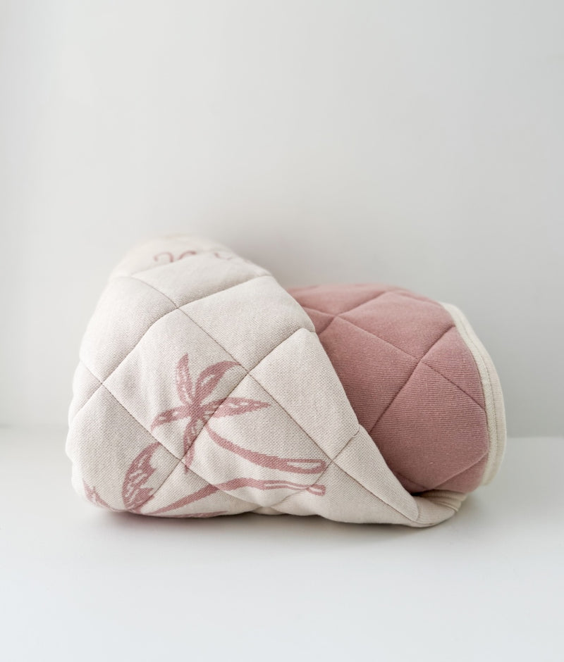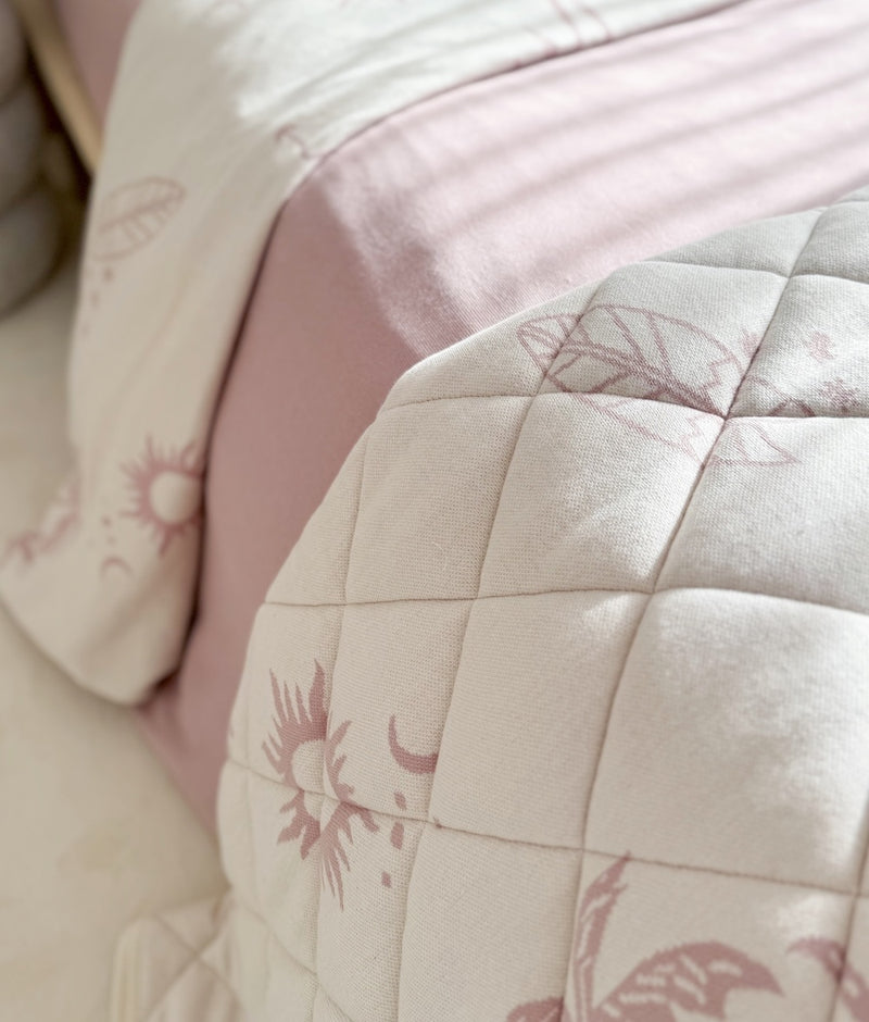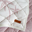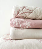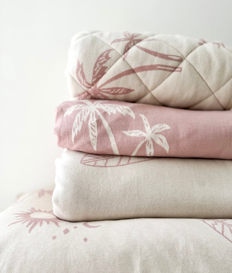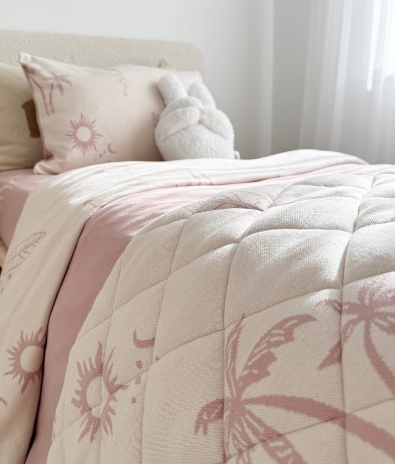 Calico Ivory with Cameo Pink Palm Trees, Suns, & Surfboards - with a plain Cameo Pink reverse. Woven from 100% Pure Cotton, our luxuriously soft quilted blankets provide maximum comfort and warmth during sleep time.