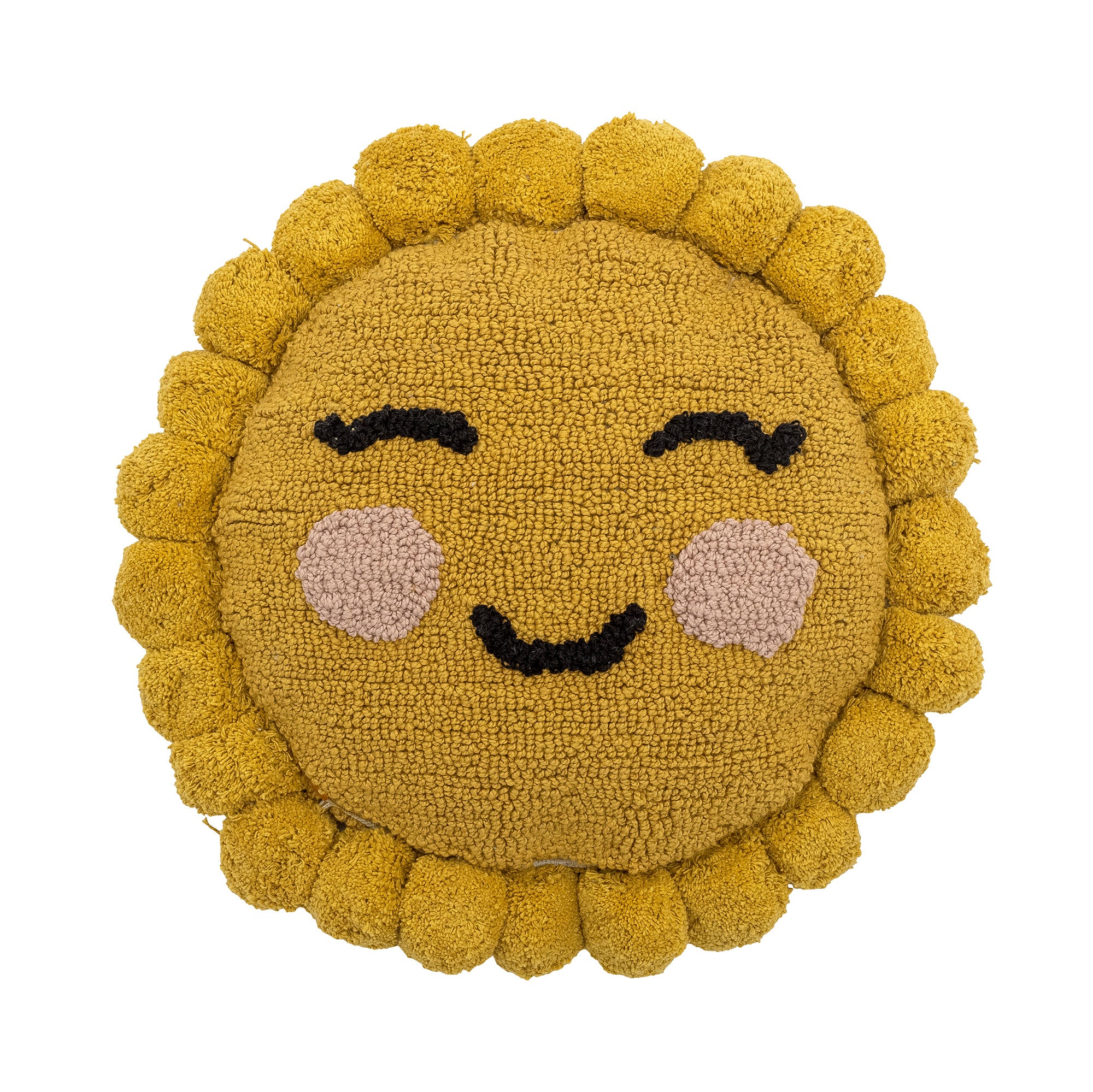 The Vigge Cushion by Bloomingville MINI is the perfect addition to any children's room. This charming cushion depicts a sun with a sweet, smiling face, sure to delight any child. The cushion is comfortable to lie on and is adorned with soft round tassels along the edge - perfect when the children need relaxation or a hug.