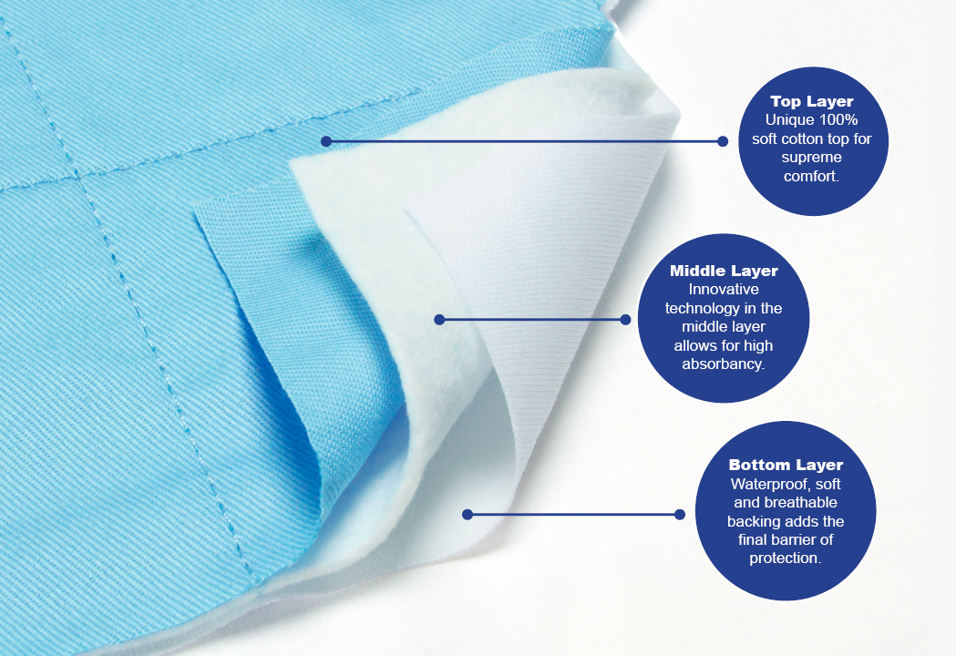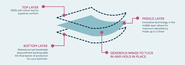 Just pop the Brolly Sheet on top of your bottom, fitted sheet with the quilted side up, then tuck in the wings to hold in place. Your loved one sleeps on top of the cotton surface. The waterproof layer protects your mattress, they hold up to 2 litres. Once your Brolly Sheet is wet, simply whip off the bed and replace with a clean one. No more striping the bed!