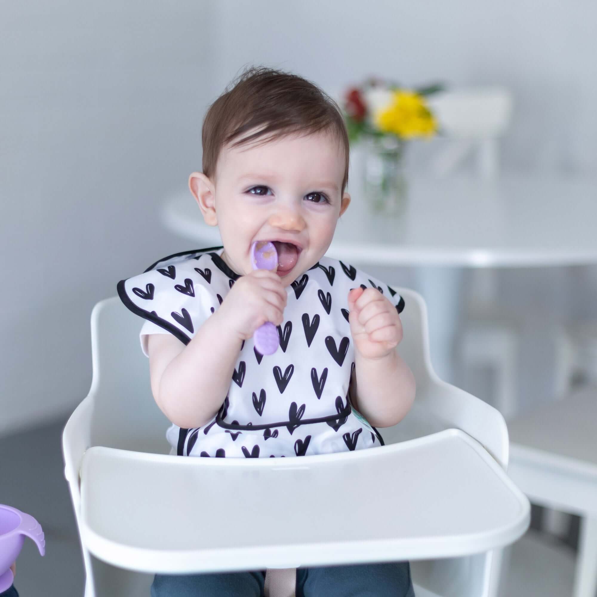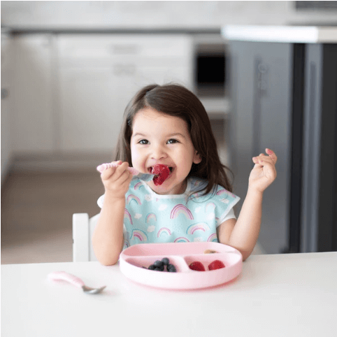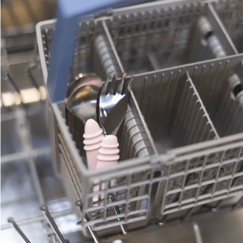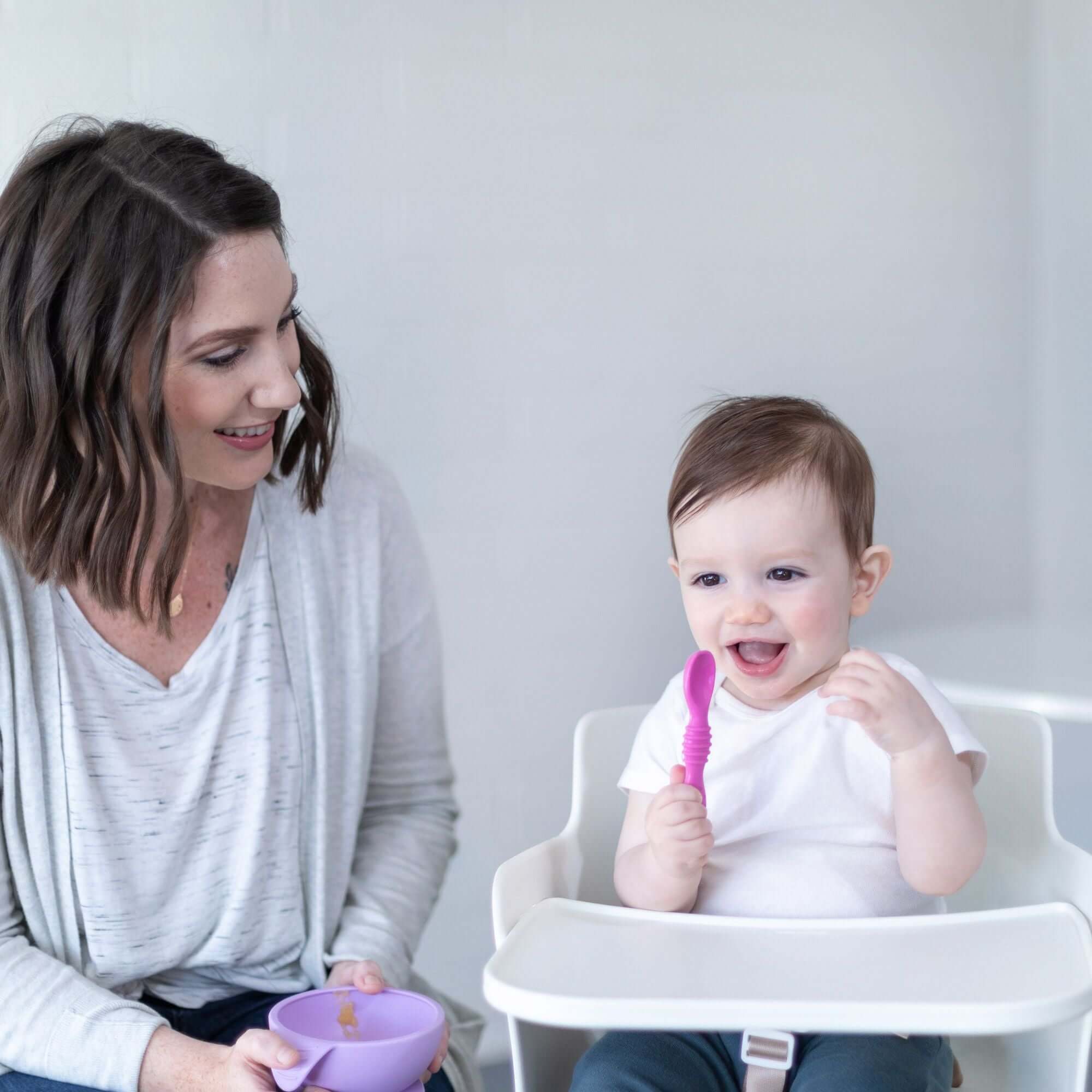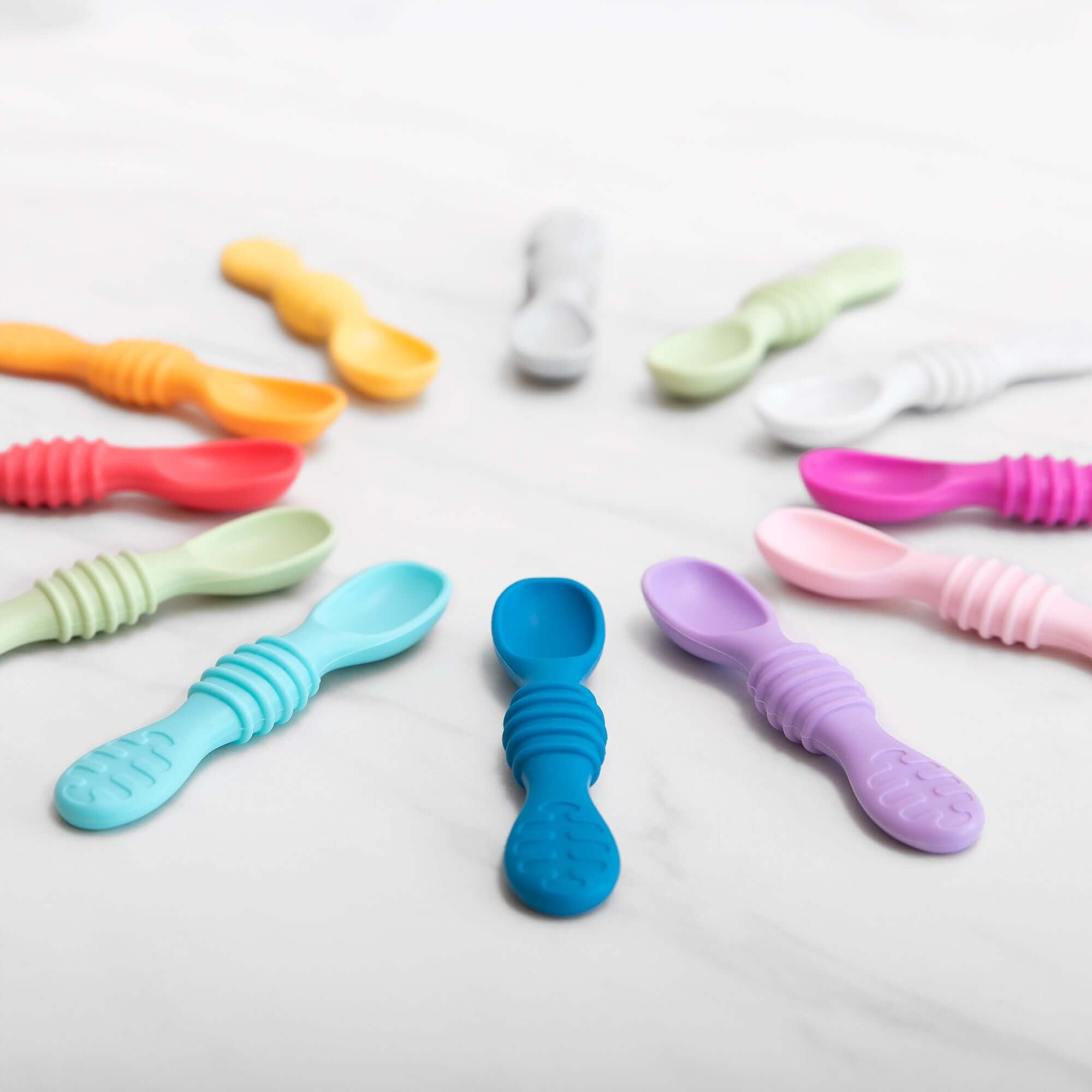 Little ones can dig into mealtime with our Spoon + Fork Set. Stainless steel fork and spoon heads are sized and shaped for toddlers. The concave heads help keep food on the fork or spoon, helping promote self-feeding with solid foods. The outer fork tines are bent to help spear foods and keep food on the fork. Handles are textured silicone so they’re easy-to-grip. Safe to use – made from 100% food-safe silicone.