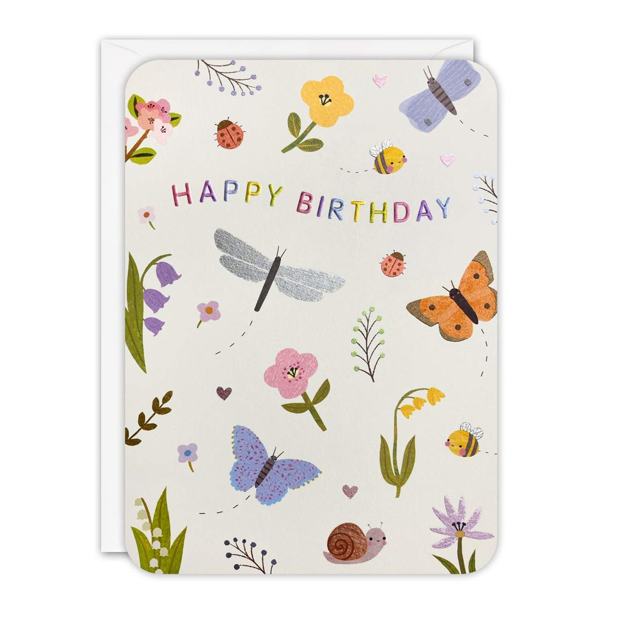 A colourful children's birthday card with rounded corners, illustrated by Linda Tordoff. The image on the front of the card features a pattern of flowers, butterflies and other cute garden creatures.
