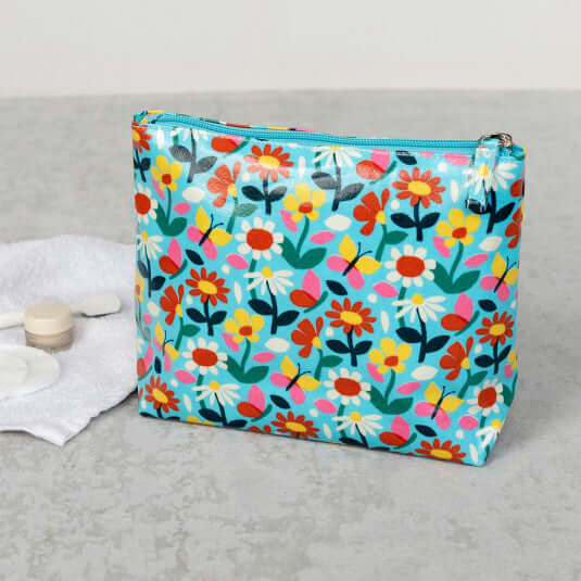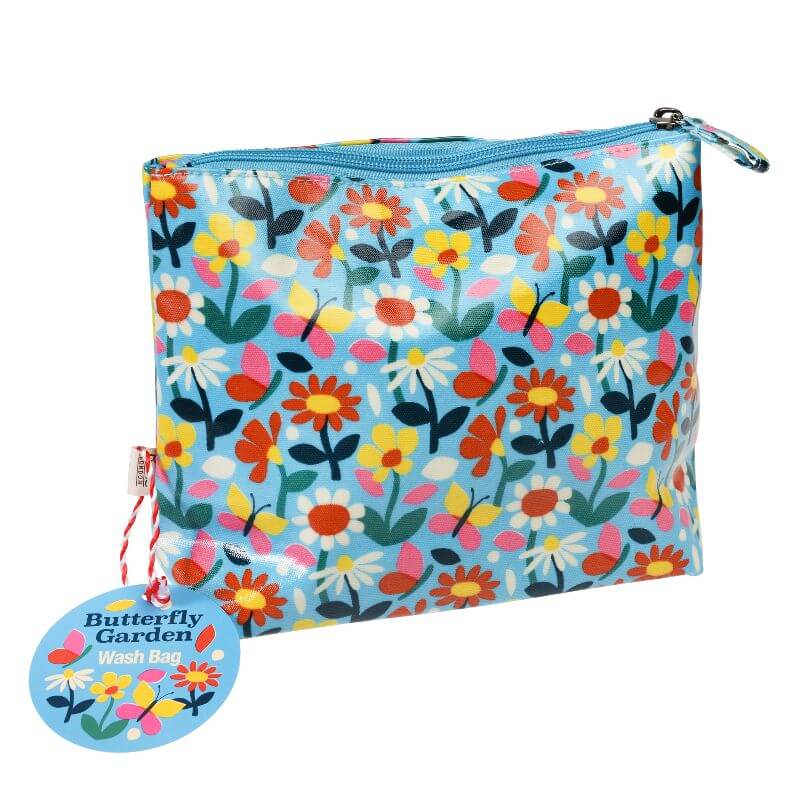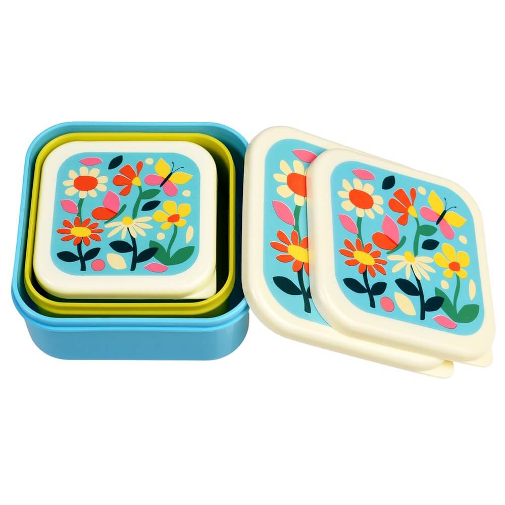 Set of three nesting snack boxes in a colourful Butterfly Garden design, suitable for lunch boxes and days out.
