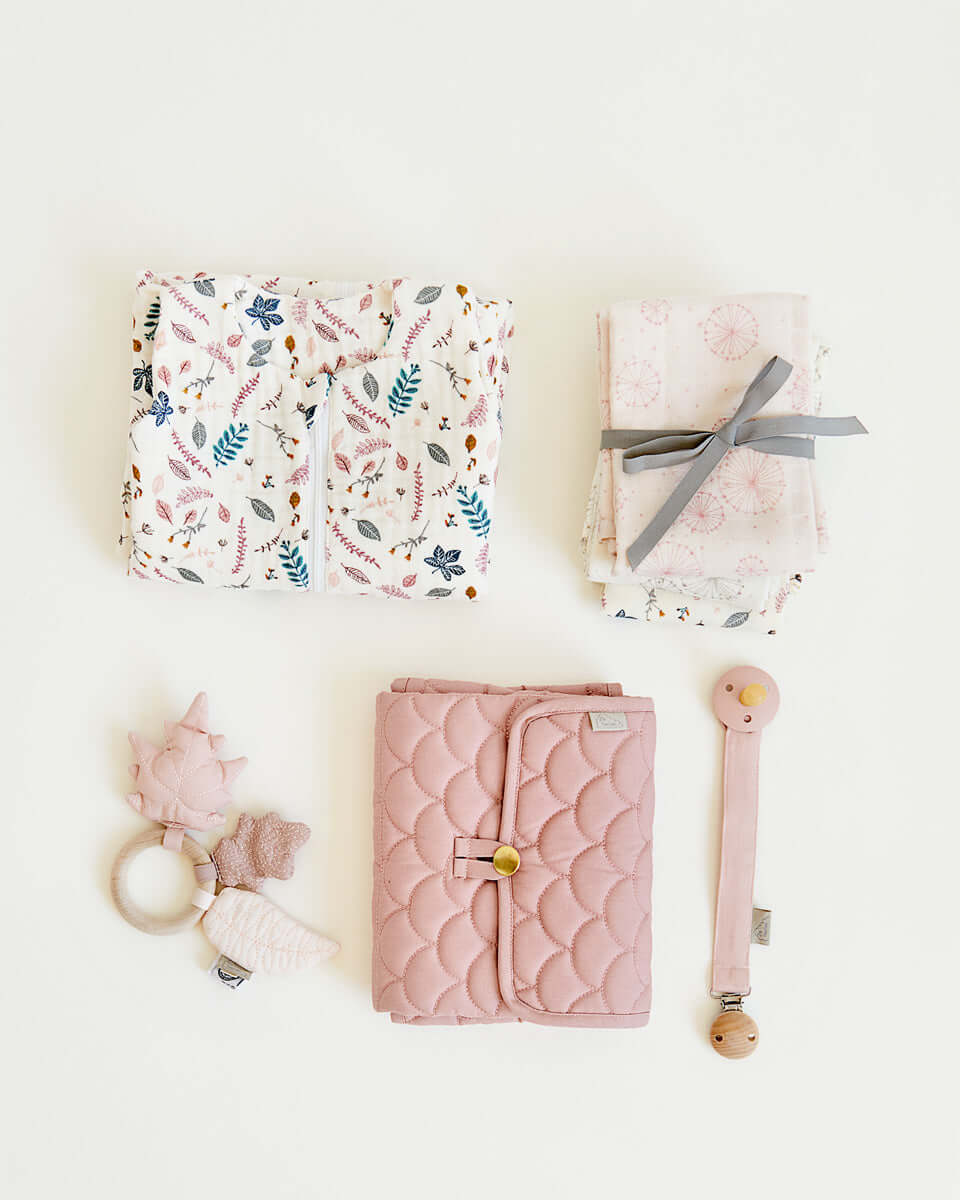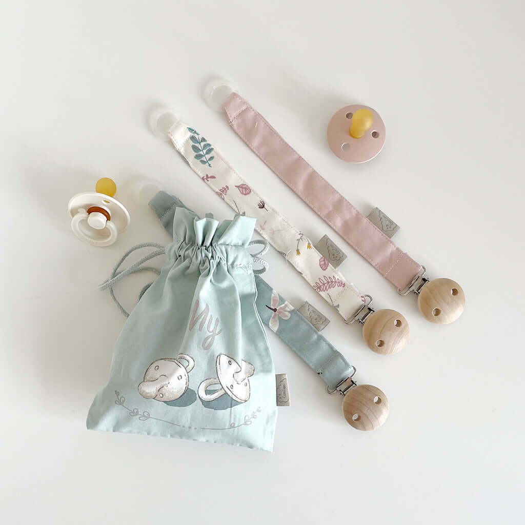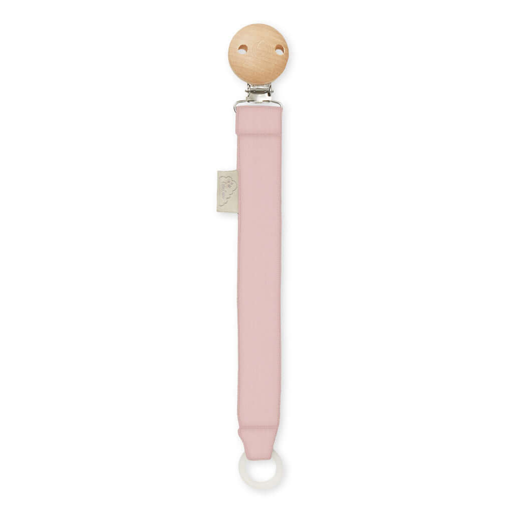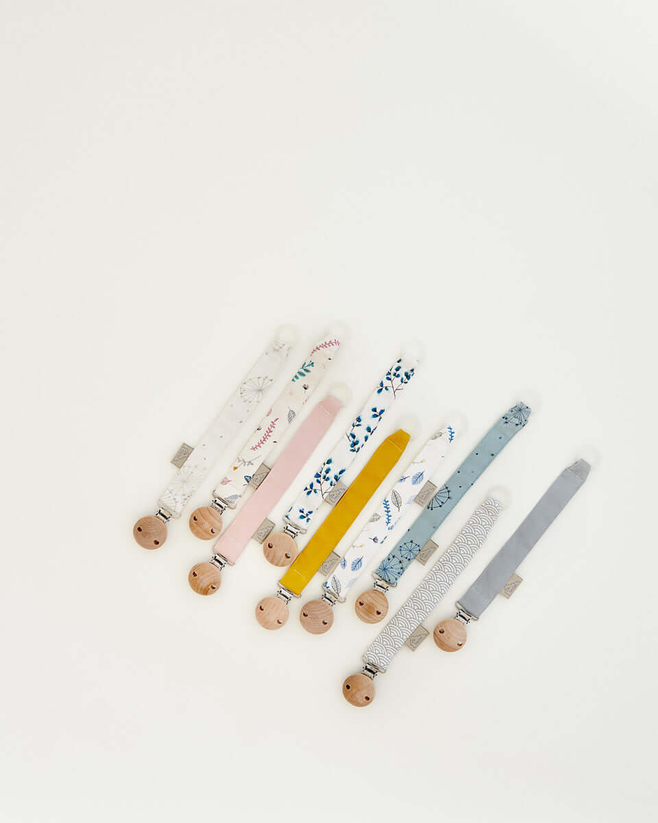 The pacifier holder has a strong 100% natural rubber ring, interfacing inside to avoid twisting and a smart wooden clip with nickel-free metal to attach the holder to the child's clothing.