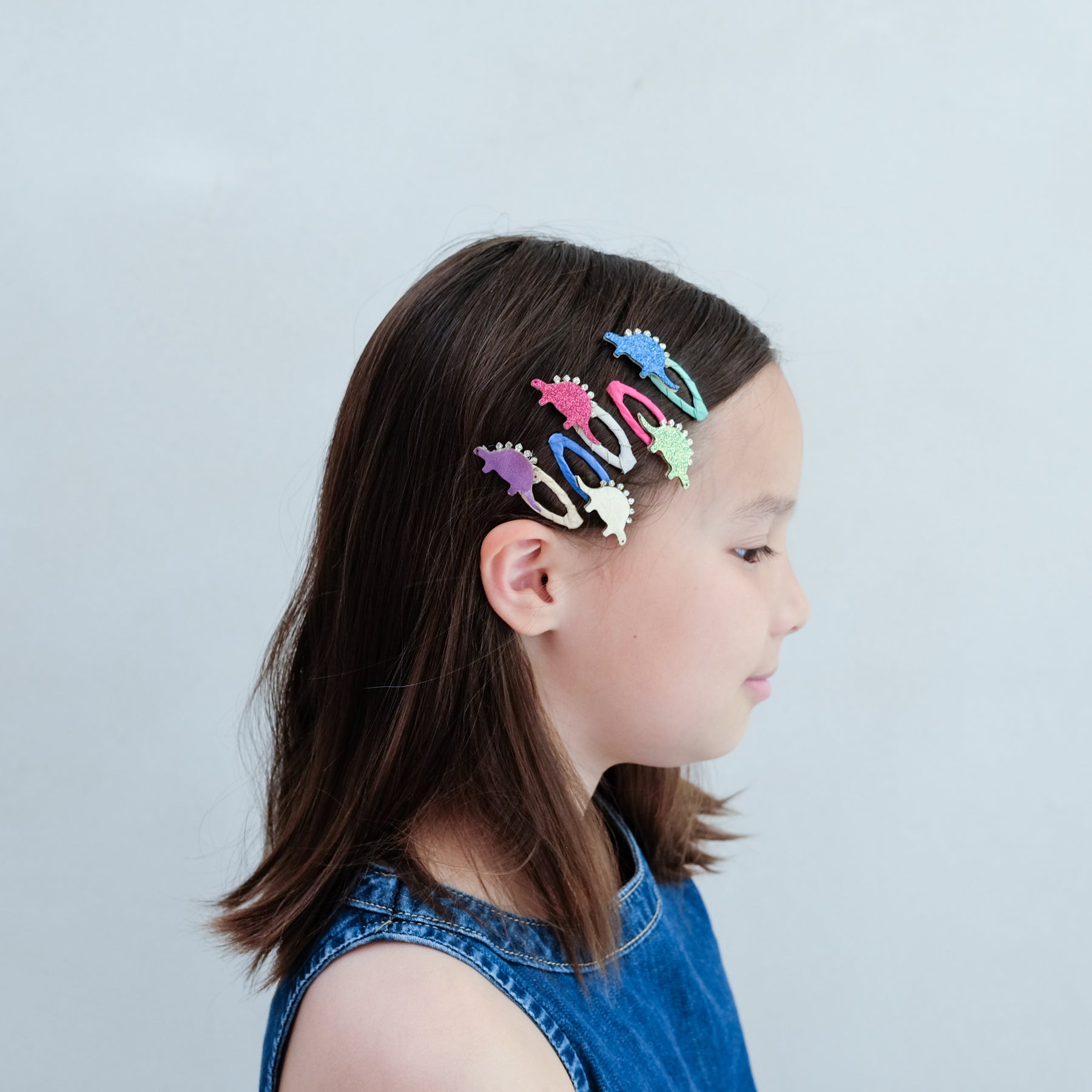 Little dino fans will just love this roar-some pack of super sparkly steggy clips! Perfect for adding some fearless fun to any hairstyle!