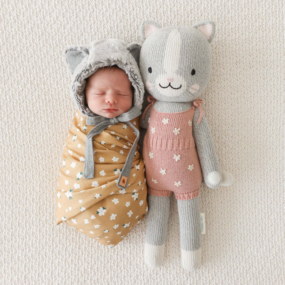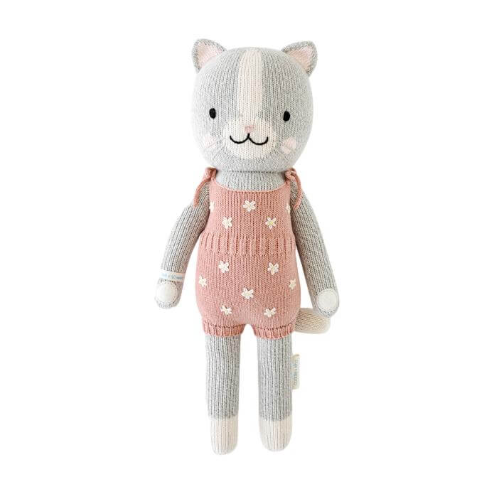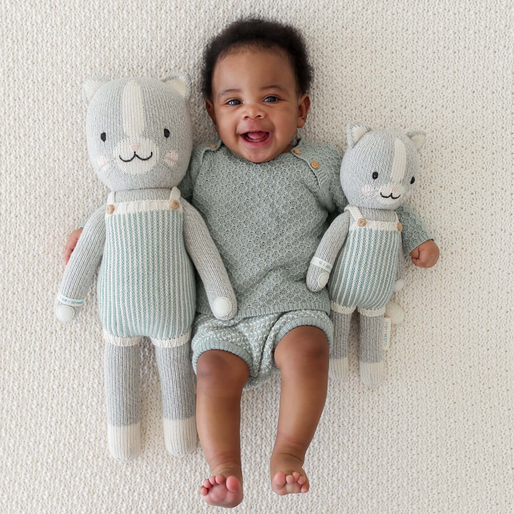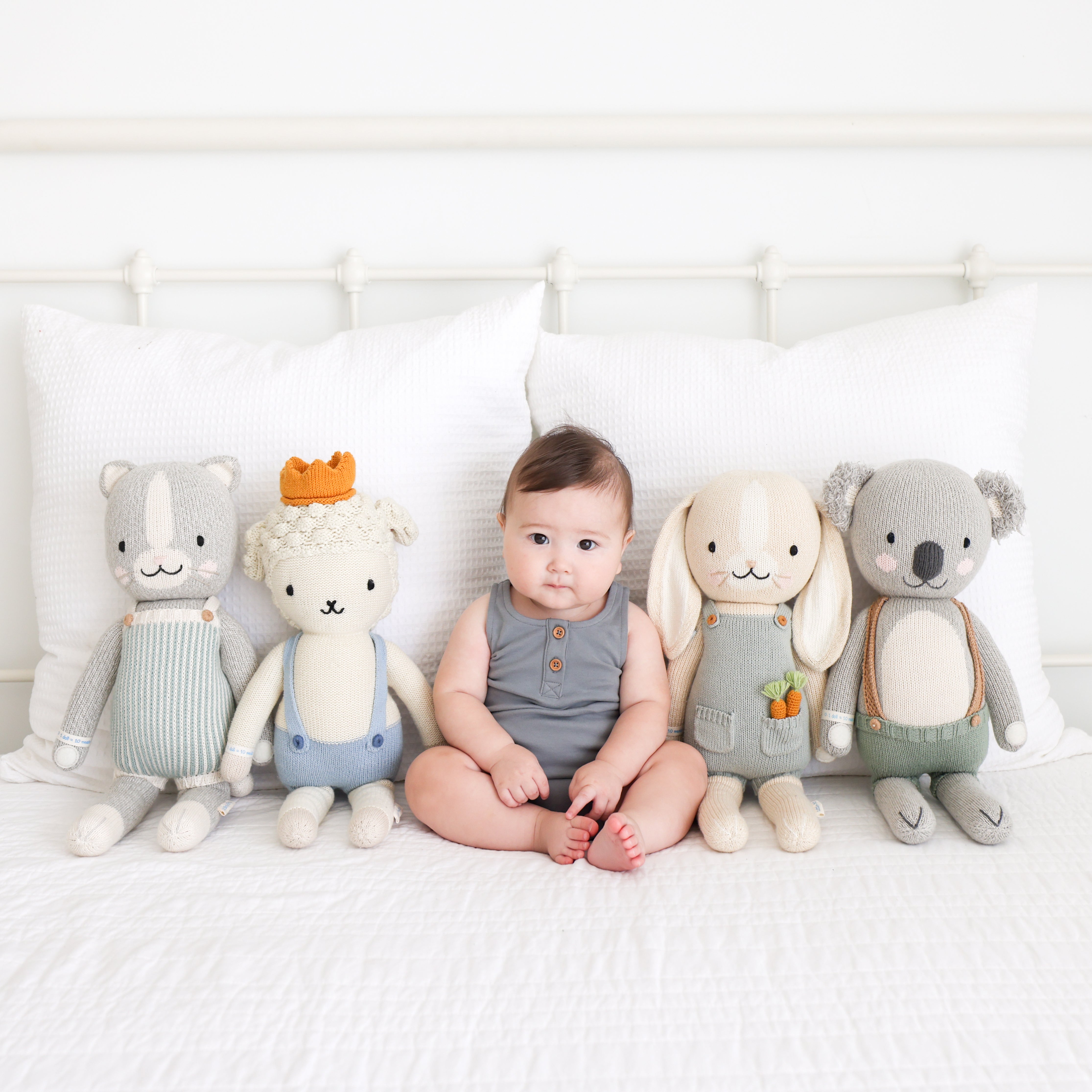 Every cuddle+kind doll is hand-knit with natural, premium, 100% cotton yarn that has been safety tested. They are finished with hypoallergenic felt details and stuffed to the ideal cuddle weight with hypoallergenic polyester filling.