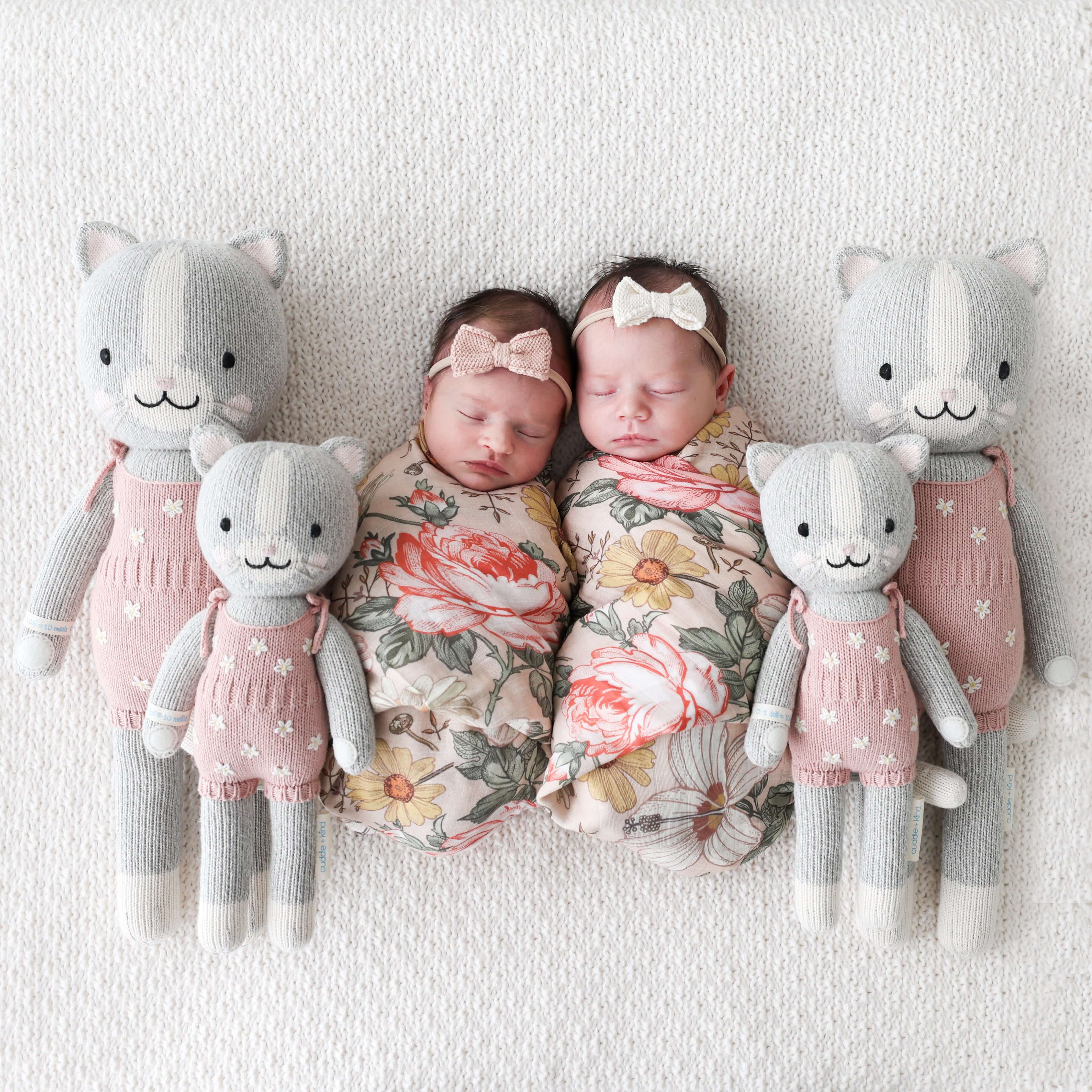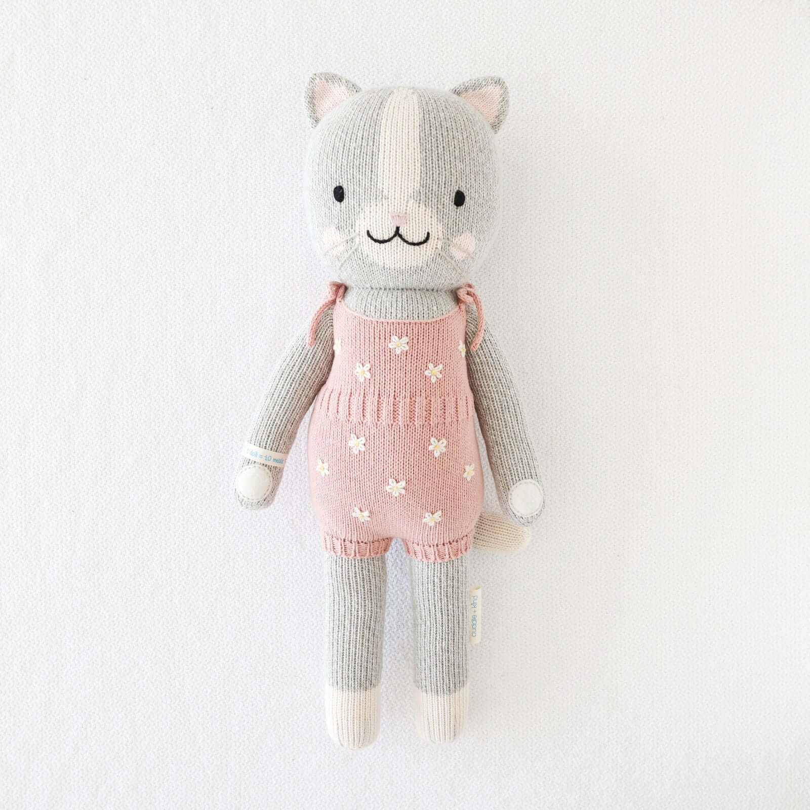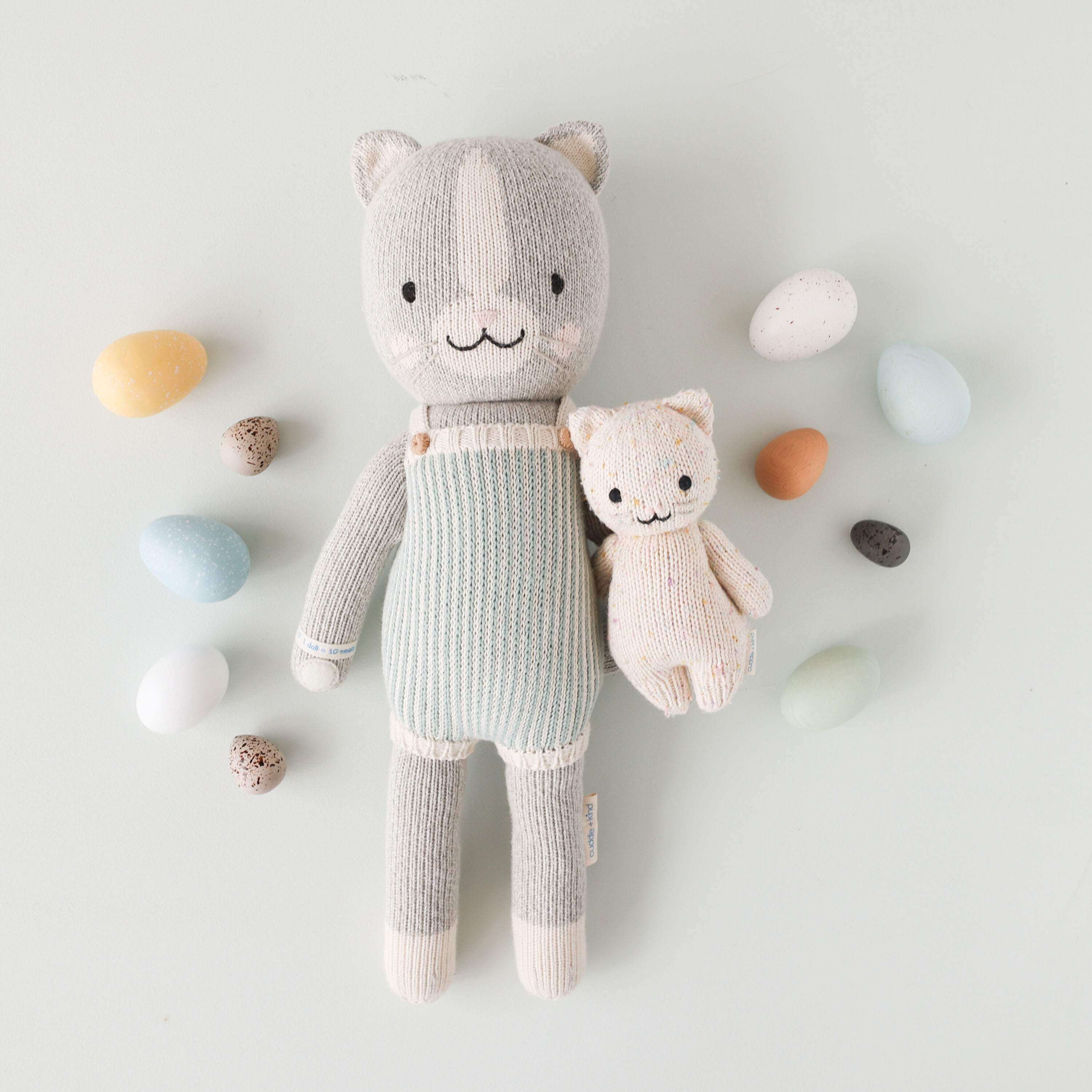 Every cuddle+kind doll is hand-knit with natural, premium, 100% cotton yarn that has been safety tested. They are finished with hypoallergenic felt details and stuffed to the ideal cuddle weight with hypoallergenic polyester filling.