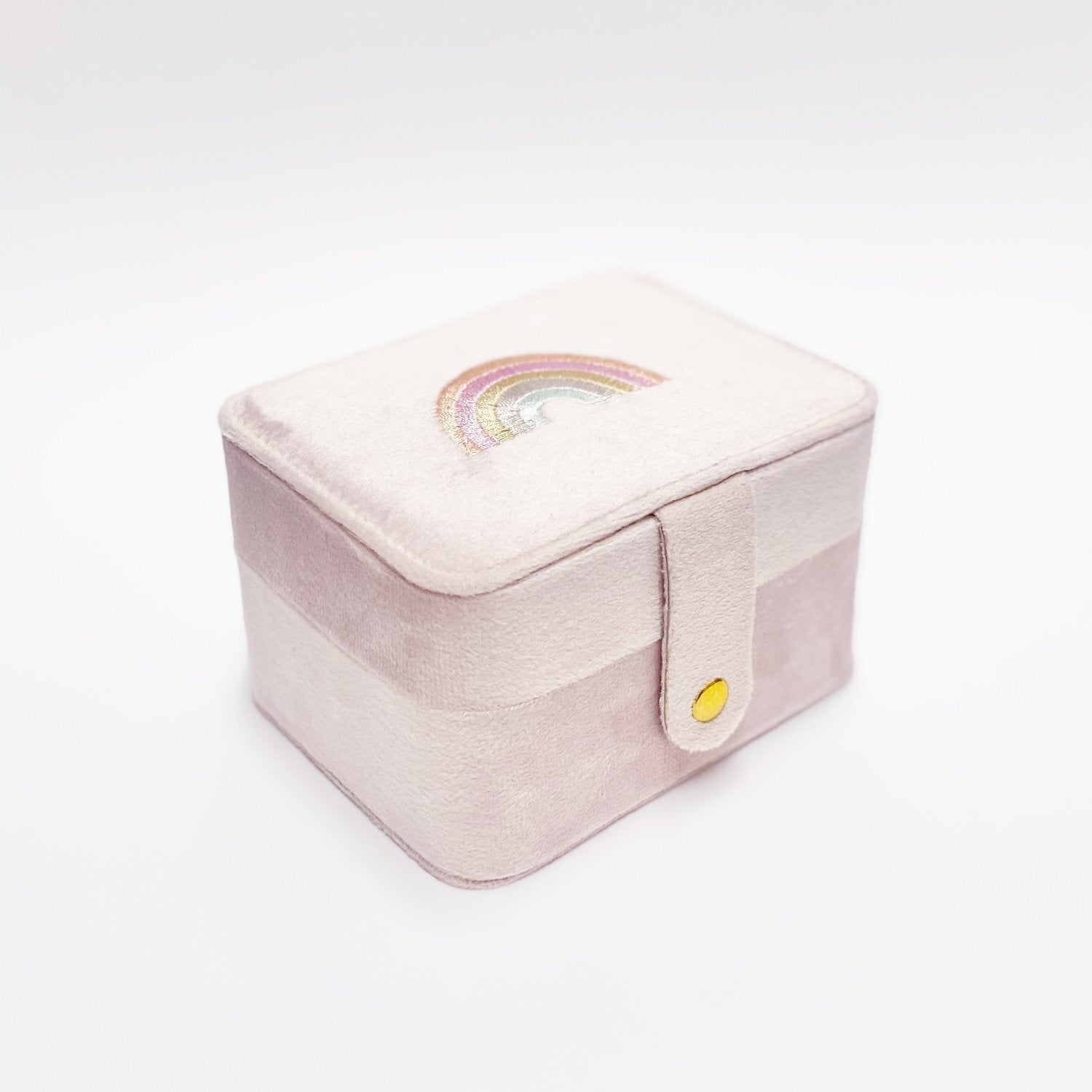 Our gorgeous super soft velvet jewellery box is the perfect place to keep all your Rockahula jewellery and favourite treasures safe! Featuring a beautiful embroidered rainbow on top, this jewellery box has a popper fastening to reveal four compartments, a slip pocket and a dedicated space to slot earrings and rings.