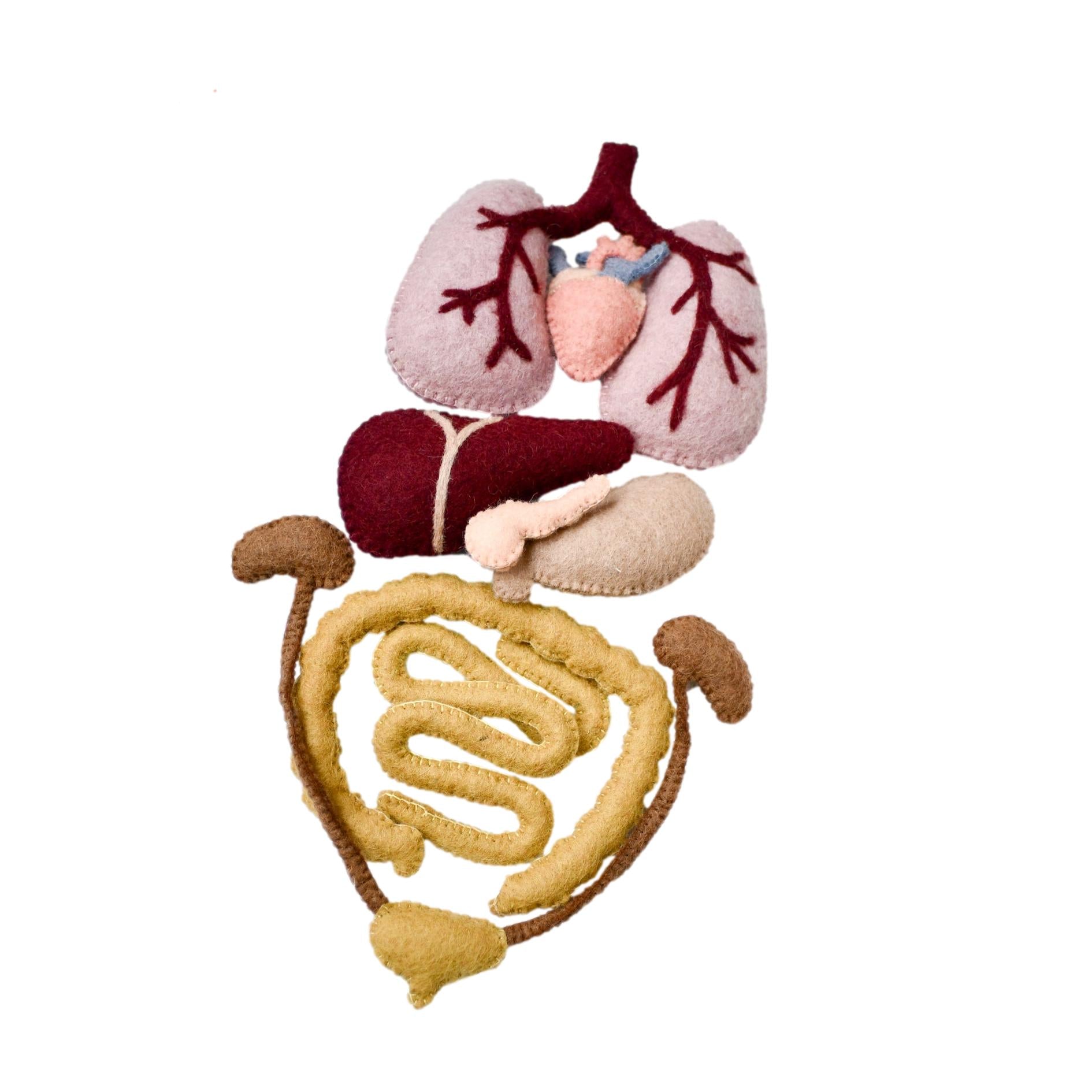 This Felt Anatomy Set consists of 8 major organs - Lungs, Heart, Liver, Pancreas, Stomach, Large Intestines, Small Intestines, Kidneys (attached to the Bladder).