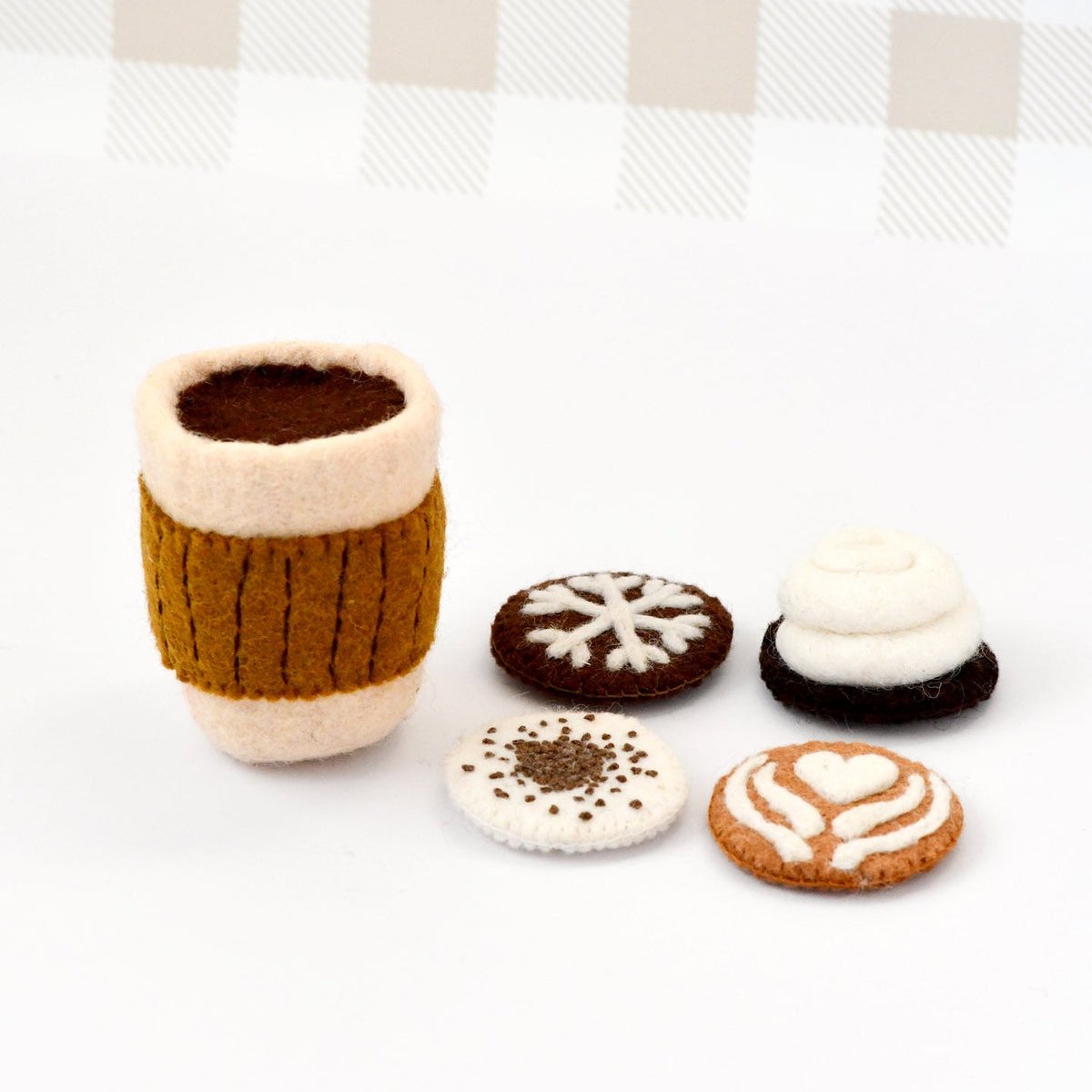 From frothy cappuccinos to a creamy latte, children can switch the toppings and create their favourite drinks, adding a fun and interactive element to their play kitchen or cafe. Handcrafted with attention to detail, this felt coffee cup encourages role play and helps foster creativity while introducing concepts of social play. The perfect addition for little baristas!