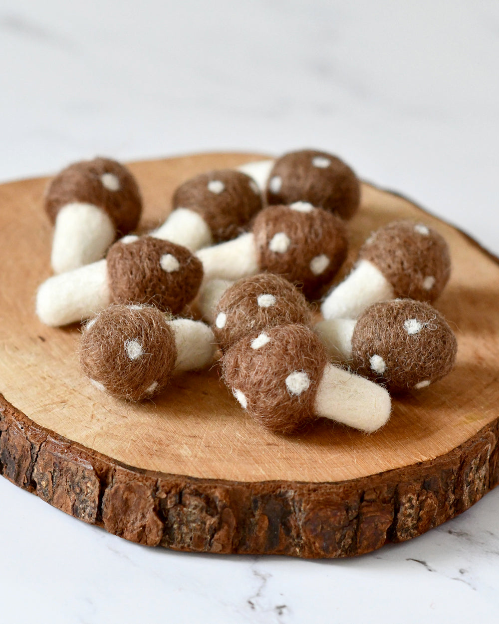 Small felt brown mushrooms in a set of 10. These little felt mushrooms are ideal for counting and sorting, Loose Parts Play and Small World Play.