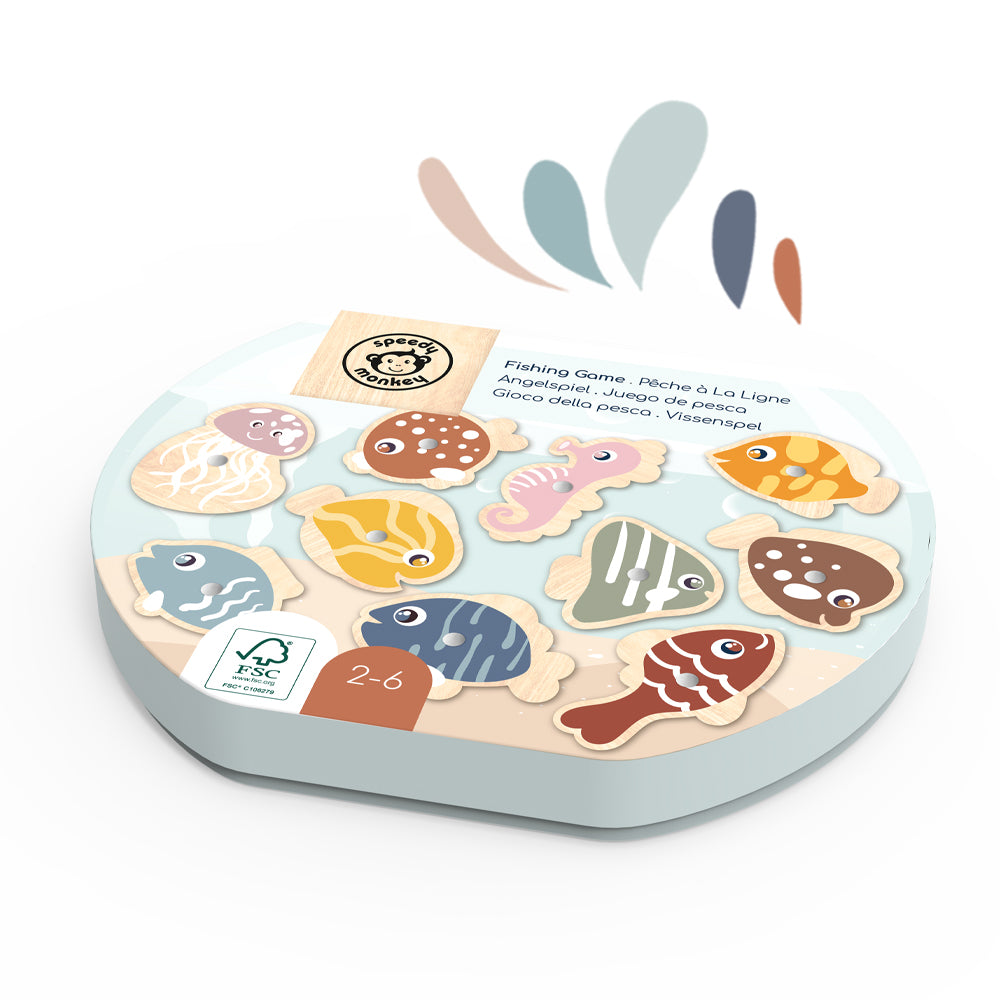 Time to go fishing. Grab your fishing rod for a fun time! These colorful wooden fish can be hooked up by the magnetic rod and once safely attached, lowered back onto the wooden board. Requires skill and concentration to catch each fish. Helps to develop dexterity and co-ordination.