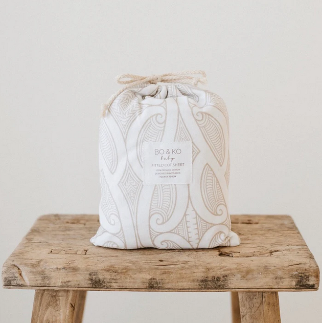 BO & KO Baby Te Pātiki Fitted Cot Sheets are made from buttery soft 100% organic cotton fabric.