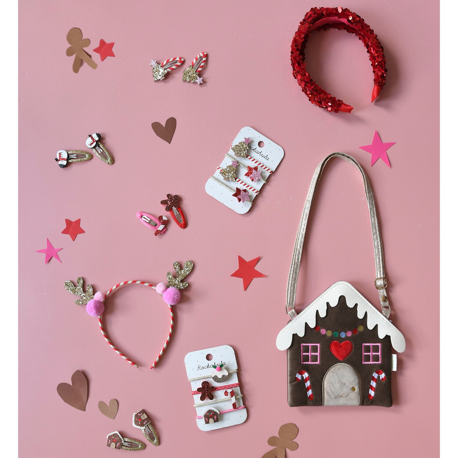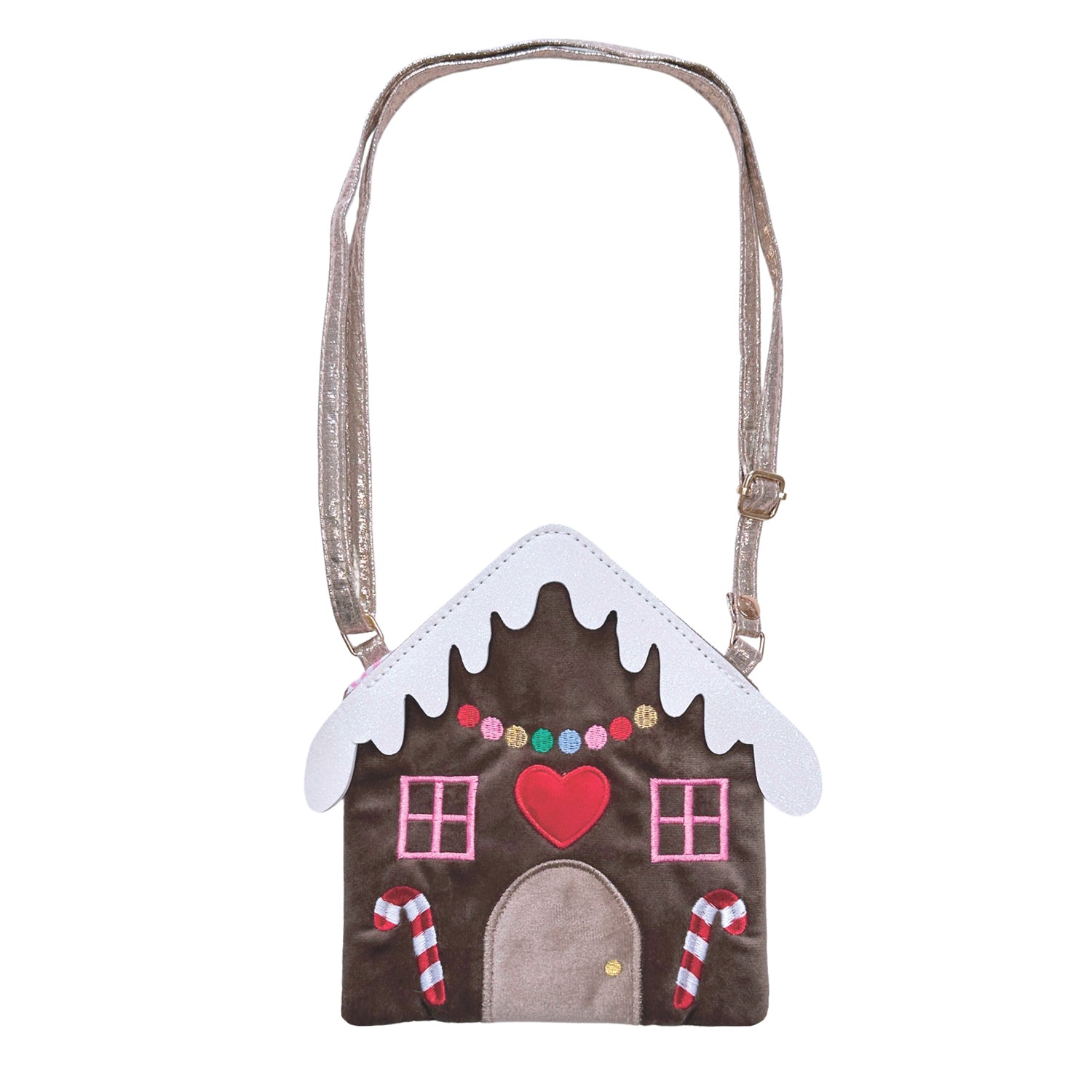 This cute and cosy gingerbread house bag is perfect for stashing away your Christmas treats! Made from the softest brown velvet, with brightly coloured embroidery details and a shimmering roof of glitter snow. Fully lined in pink stripe fabric, this velvet bag features a magnetic dot closure and an adjustable gold strap with a break point for safety.