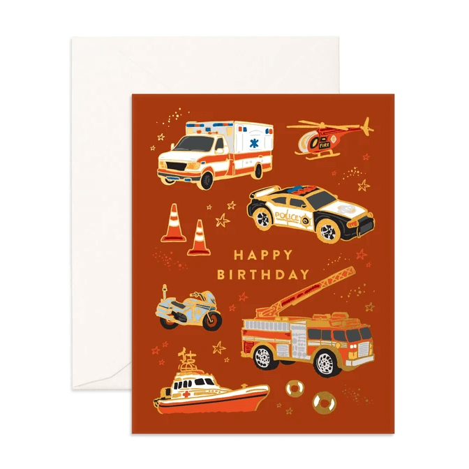 Happy birthday gift card for all ambulance, police, fire and rescue lovers.