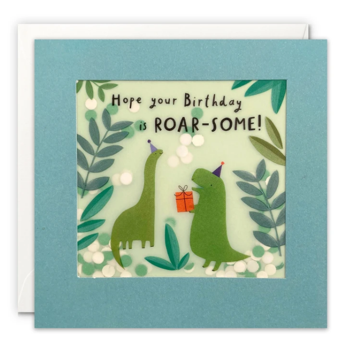 A hand finished birthday card illustrated by Kate Mainard. The image on the front features two dinosaurs wearing party hats, with a birthday present, surrounded by leaves.