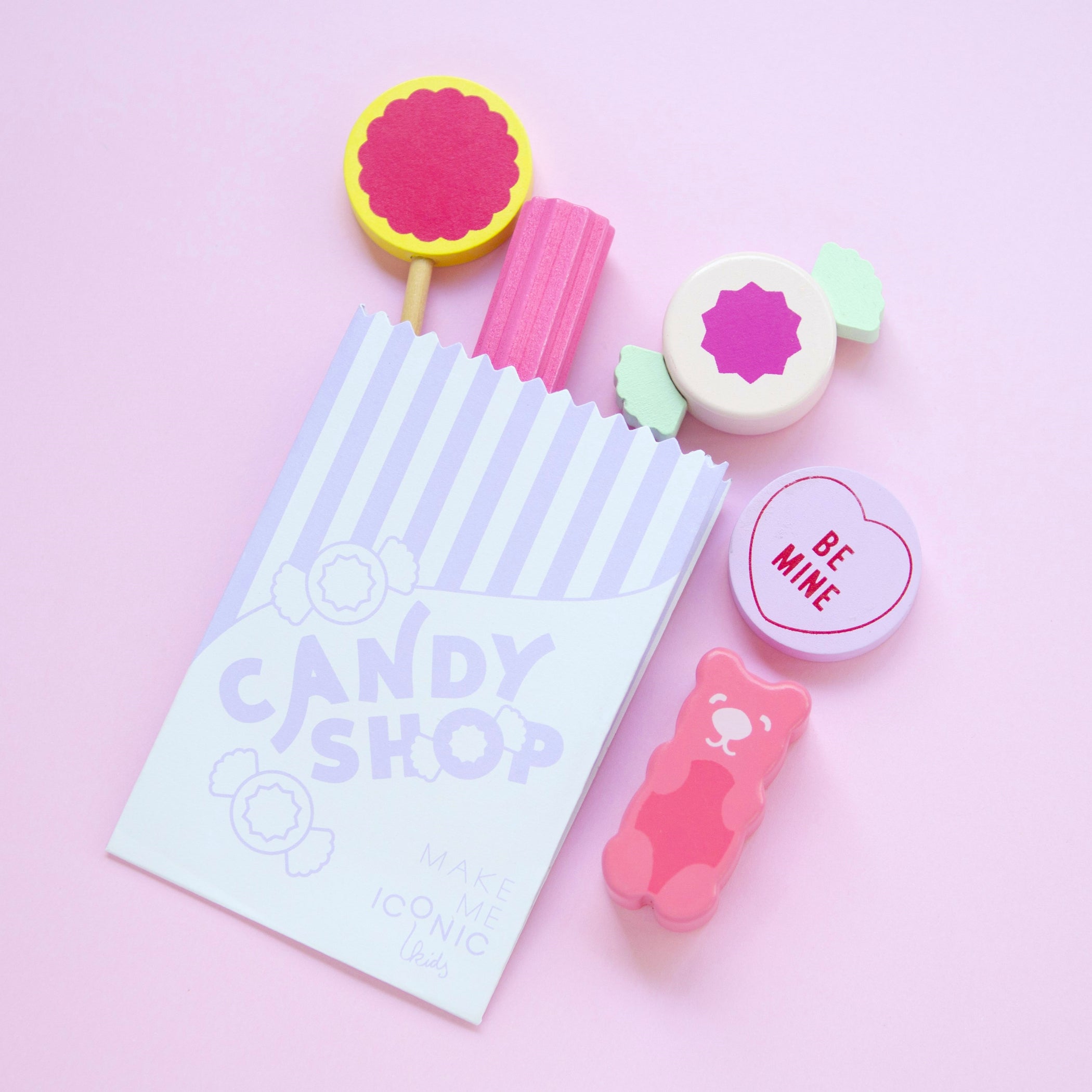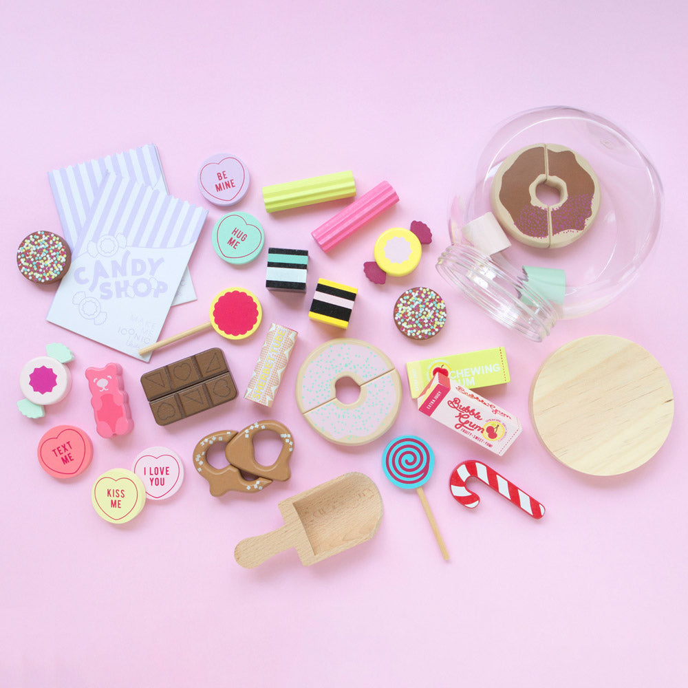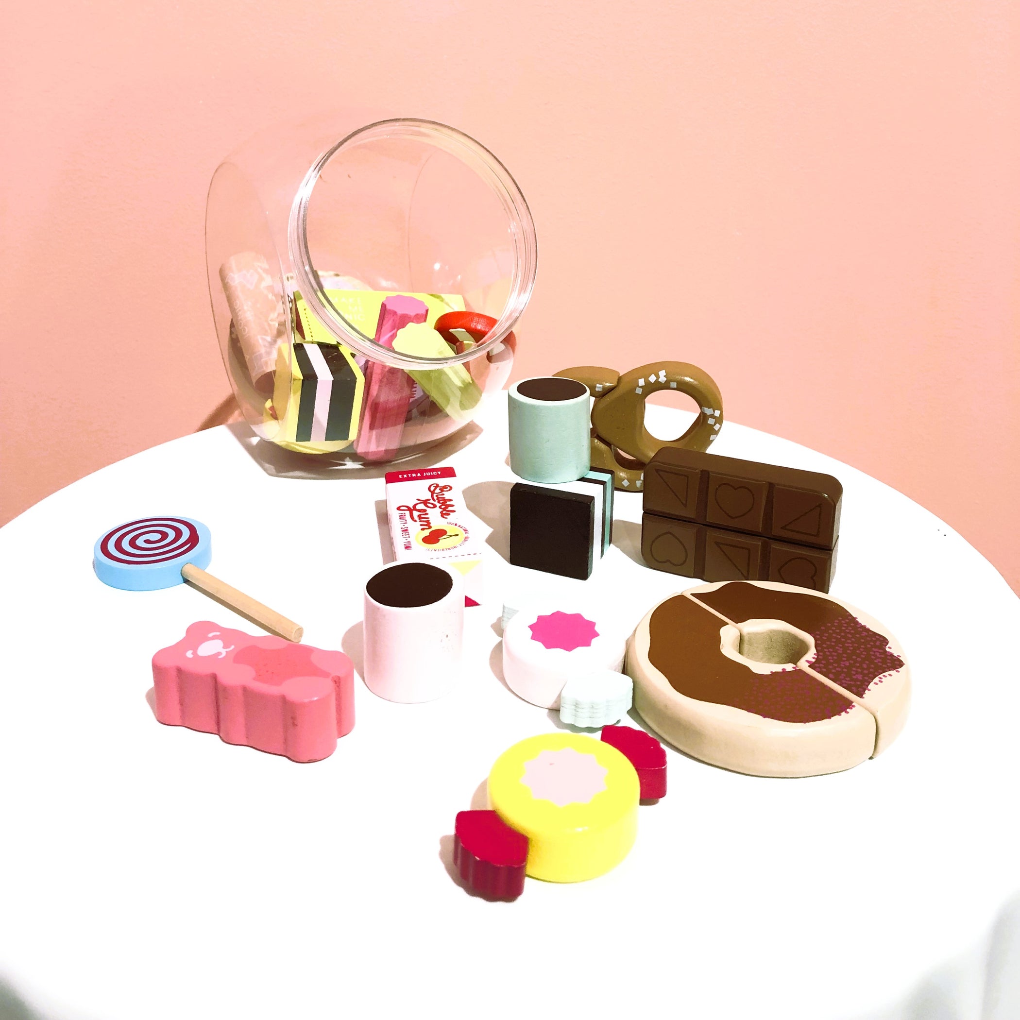 Complete with 1 x clear candy jar with wooden Lid, 2 x lolly pops, 5 x heart sweets, 2 x musk sticks, gummy bear, pretzel, candy cane, 2 x chocolate freckles, 2 x donuts, chocolate bar, 4 x liquorice pieces, 2 x wrapped lollies, sherbet tube, chewing gum packet, bubble gum packet, wooden scoop and x5 paper lolly bags for pretend play