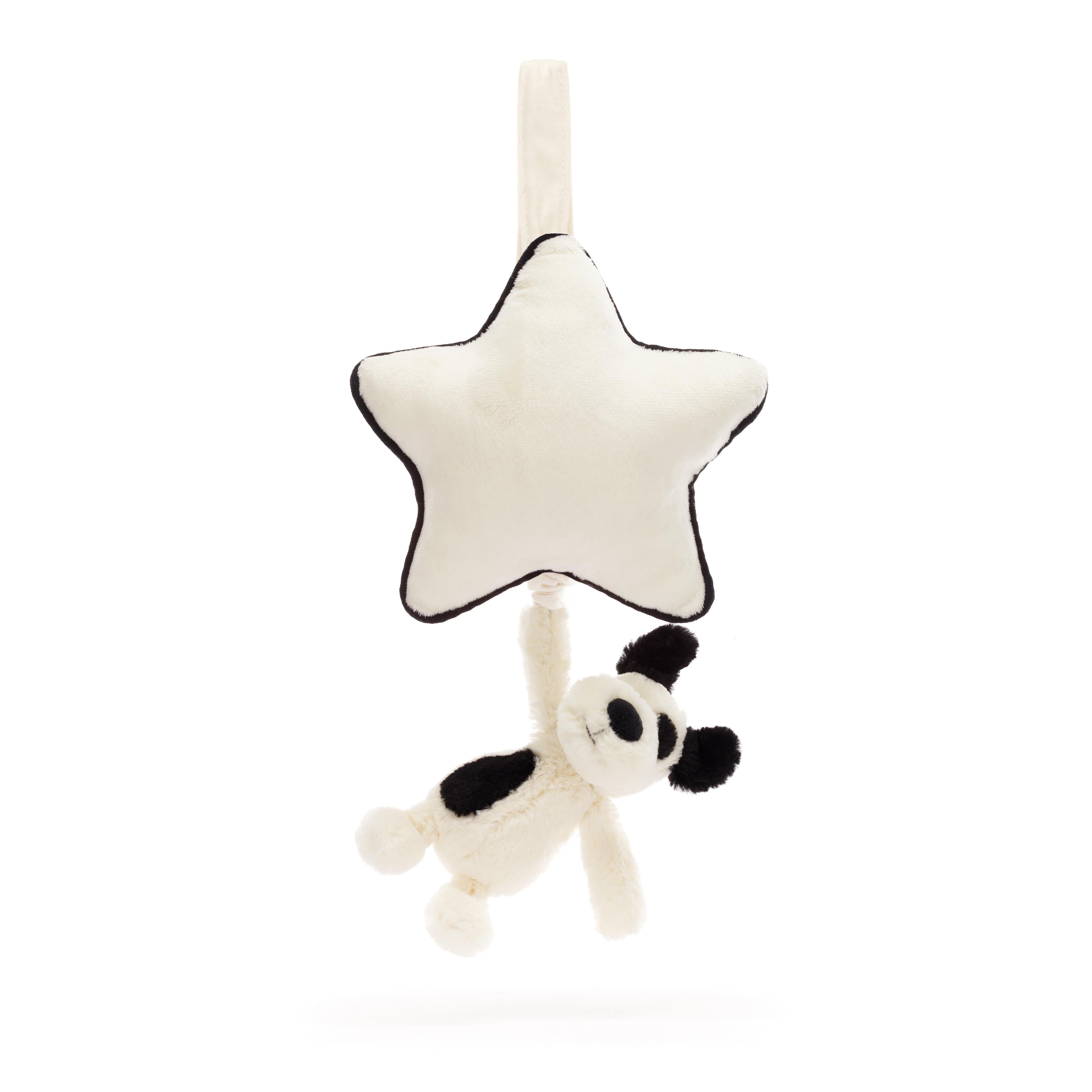 The Bashful Black & Cream Puppy Musical Pull is a soothing gift to help babies drift off. Our most loved black-and-white pup has gorgeous cream fur with liquorice-coloured patches made with recycled fibres and holds on tight to a concertina pull. Gently pull Puppy and an original Jellycat lullaby will play from the stylishly monochrome trimmed star.