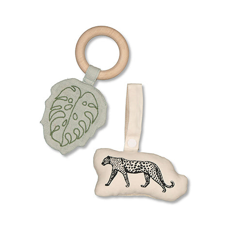 The set comes with one leopard rattle (with a tab top so you can attach it safety to play gyms, strollers and capsules), and a lush tropical leaf teether that little teeth and gums will love. Don't forget to grab a couple of our bibs too, perfect for dribble catching! And would make an ideal gift set too.