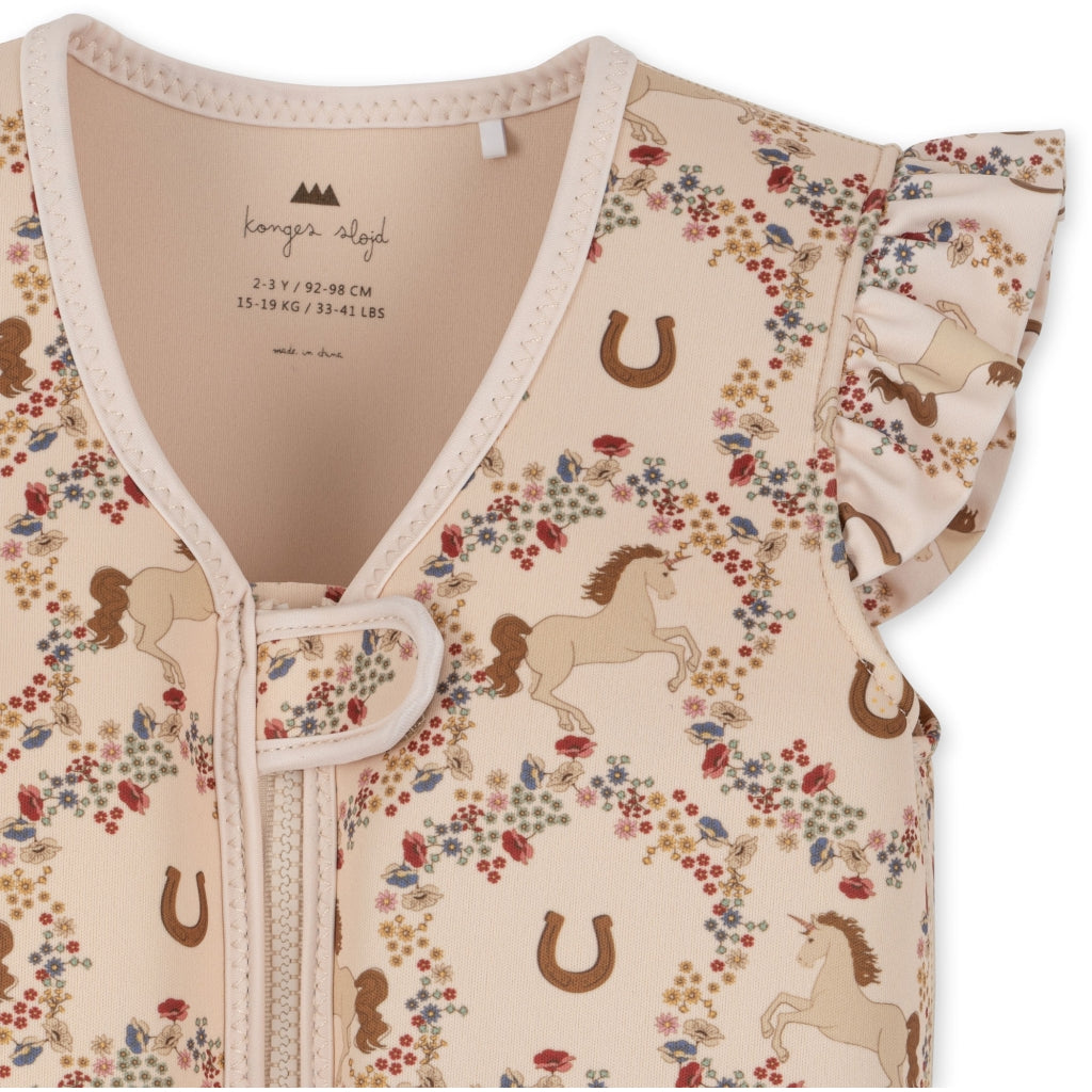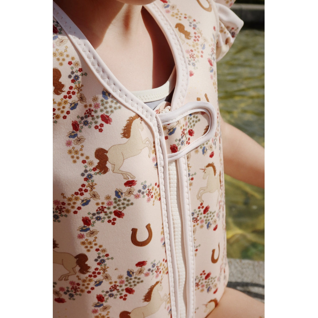 Designed with both zipper and velcro closure. Features a buckled safety crotch strap so that your child can never slip out of the vest.