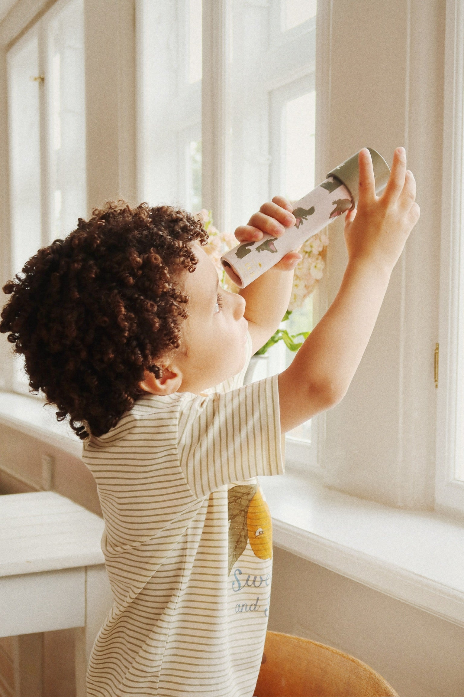 Magical kaleidoscope with pearls inside. Look inside and experience patterns and colors created by the reflections from the mirrors and colored stones.