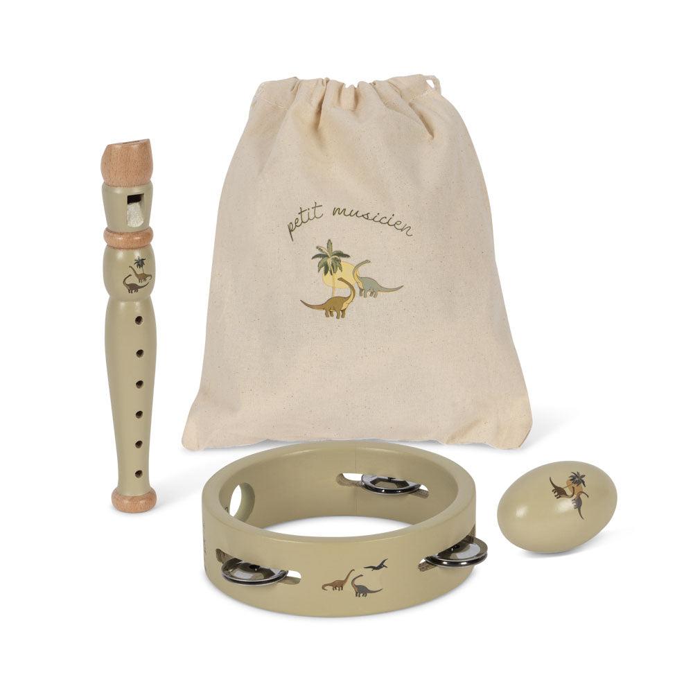 Set of music instruments for tiny musicians, gathered in a decorative drawstring bag.