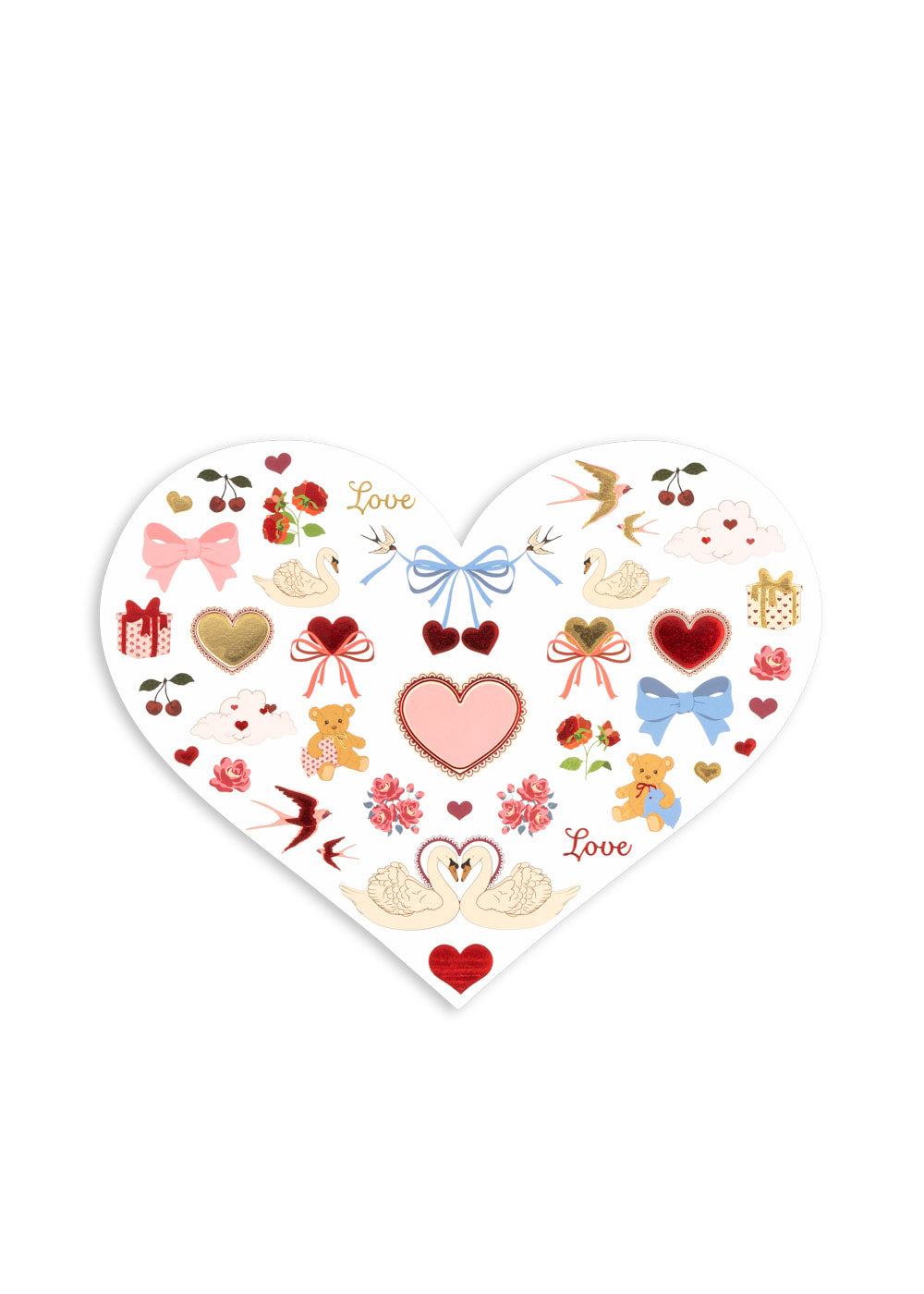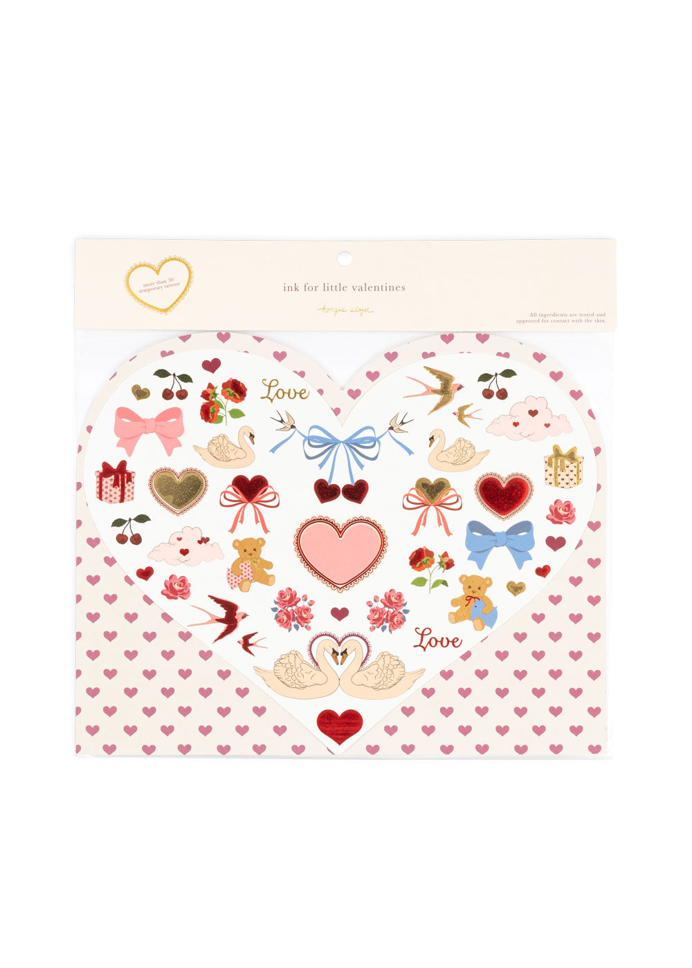 Temporary tattoos with romantic Valentine's Day motifs. Apply with water or wet sponge for less than 30 seconds. Removal is very simple, just use soap and water. Sheets include more than 30 tattoos.