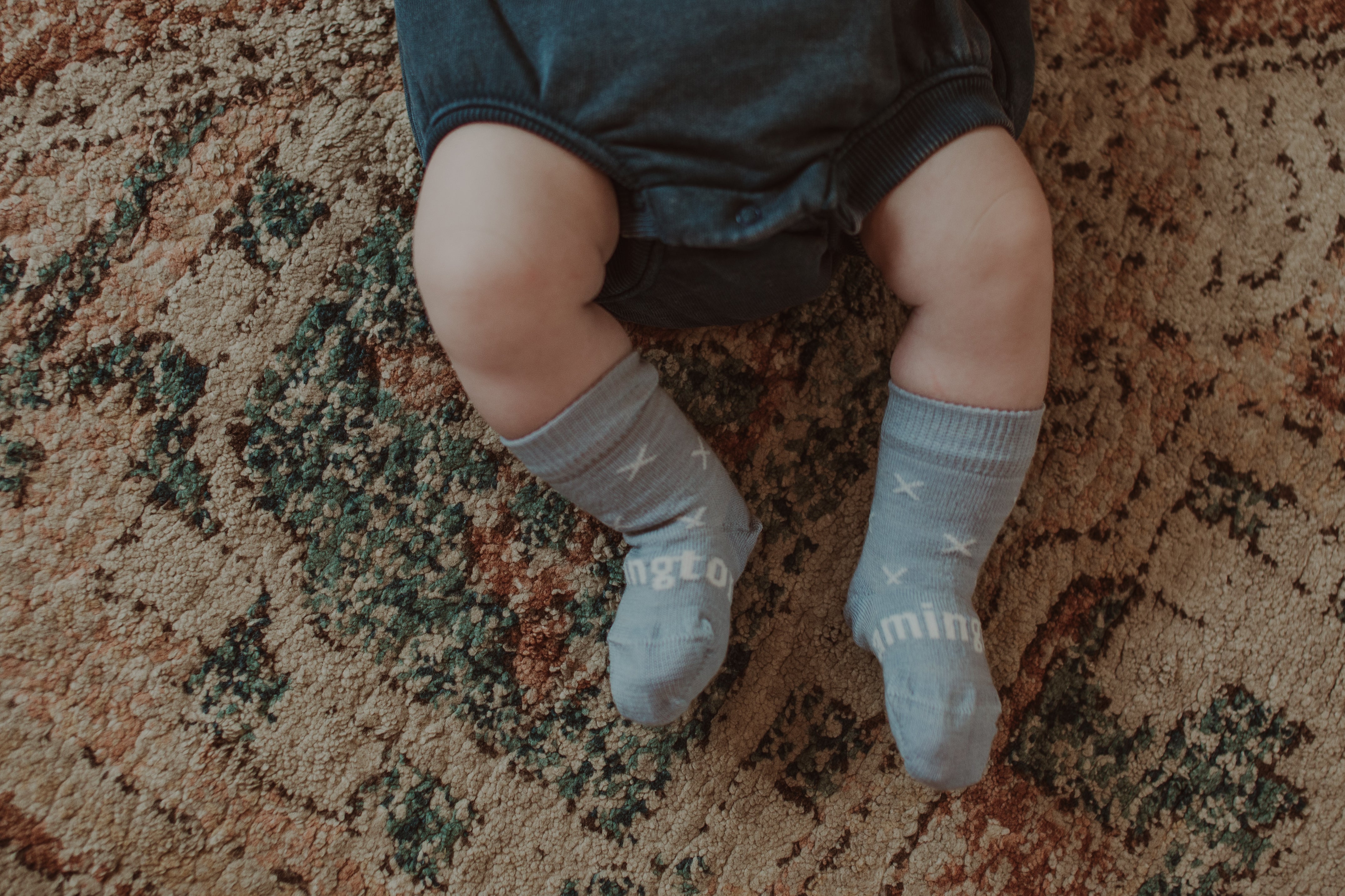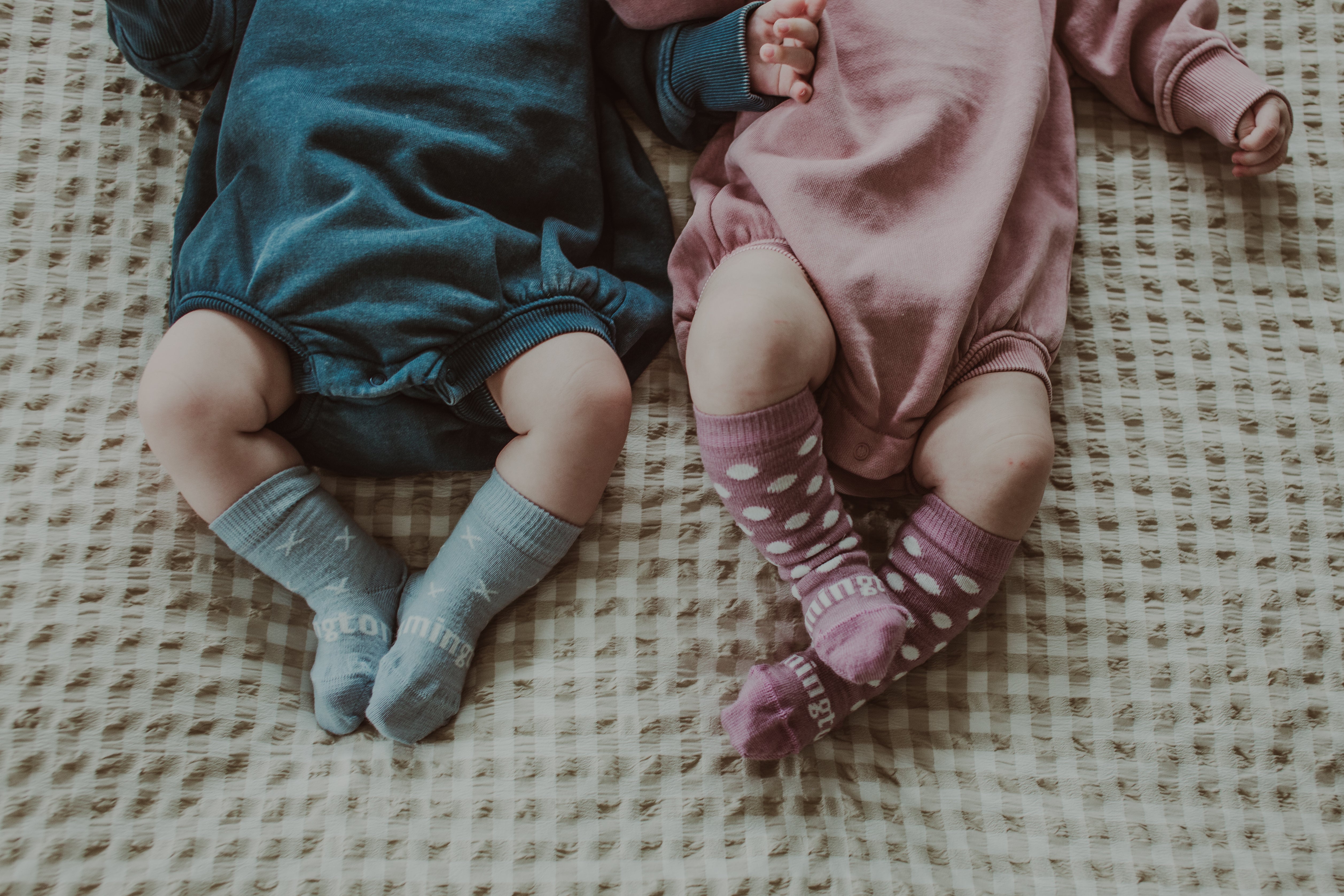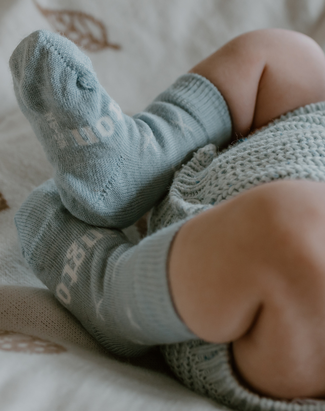 Babies come in all shapes and sizes. Our sizes are a guideline only and are not a one size fits all. To ensure your socks are not too tight on your infant always place a finger between your baby’s skin and the band of the sock to make sure the items are not restrictive. If you think they are too firm either scrunch the sock down, fold over the cuff, or go to the next size up. Alternatively use our Crew length socks which sit lower on the leg. Our knee high socks are designed to be worn below the knee.